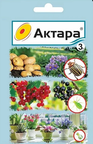 Инсектицид кишечно-контактного действия против сосущих (тли, цикадки, белокрылка), грызущих (колорадский жук, пьявица, блошки), Эффект от препарата Актара наблюдается через несколько часов после обработки.