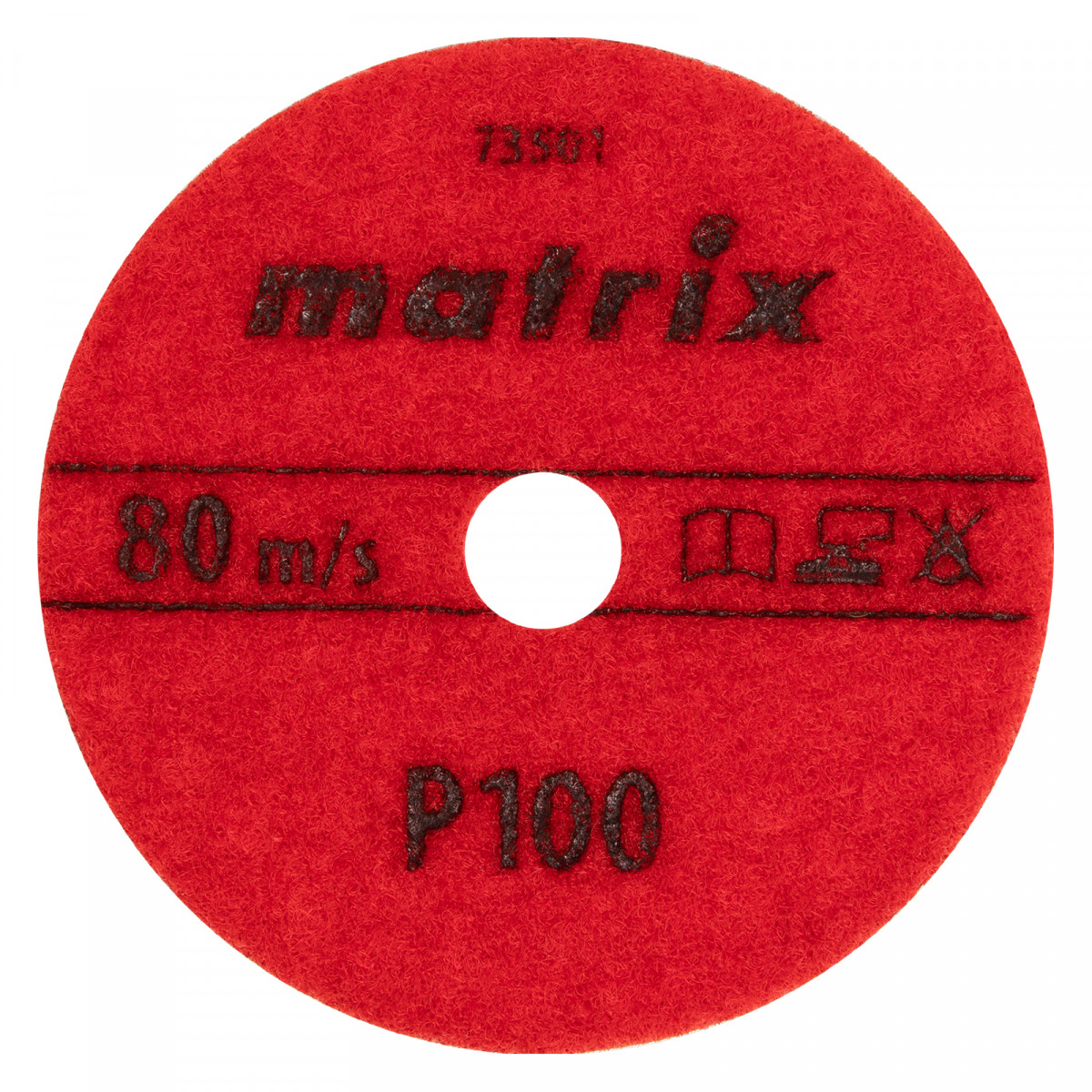 Алмазный гибкий шлифовальный круг Matrix 73501 диаметром 100 мм, с зернистостью P 100, 5 шт. в упаковке, предназначен для сухого шлифования преимущественно белых и цветных поверхностей из гранита, мрамора, природного и искусственного камня, керамогранита. Абразив с зернистостью P 100 снимает большой слой материала и используется для черновой шлифовки. Гибкий круг удобен для обработки предметов сложной формы. Оснастка используется на УШМ с установленной опорной тарелкой для АГШК.