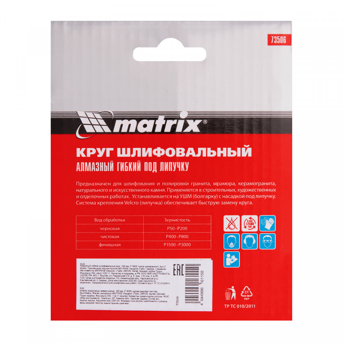 Алмазный гибкий шлифовальный круг Matrix 73506 диаметром 100 мм, с зернистостью P 3000, 5 шт. в упаковке, предназначен для сухого шлифования гранита, мрамора, природного и искусственного камня, керамогранита. Используется на поверхностях разного цвета, в том числе черных. Абразив с зернистостью P 3000 применяется для финишного полирования, позволяет добиться глянцевого блеска материалов. Гибкий круг удобен для обработки предметов сложной формы. Оснастка используется на УШМ с установленной опорной тарелкой для АГШК.