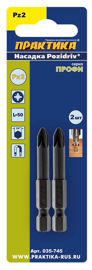 Набор бит Практика 035-745 – отличный выбор для частных и профессиональных пользователей. В комплекте – 2 биты PZ2. Длина бит стандартна – 50 мм. Инструменты устанавливаются с помощью хвостовика ¼".