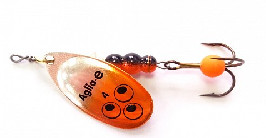 AGLIA TW — отличаются от базовой модели AGLIA двухцветной рефлекторной окраской лепестка и возможностью быстрой замены тройника. Грузик сердечника у AGLIA TW имеет внутреннюю резьбу с очень крупным шагом. Проволочная ось завершается колечком для крючка, сопряженным с пружинной шпилькой. Находясь в теле груза, пружинная шпилька упирается в уступ крупной резьбы. В данном случае шестигранный грузик служит винтовым замочком. Освобождение шпильки осуществляется простым свинчиванием груза, а возвратная фиксация — вдавливанием шпильки в его тело. Это простой, но очень надежный узел крепления (не разрушается даже при значительных нагрузках). AGLIA TW — настоящий клад для любителей экспериментов на водоемах. Рыболов получает возможность быстро укомплектовать вращалку пластиковой рыбкой, виброхвостом, твистером или просто тройником с мухой подходящего цвета.