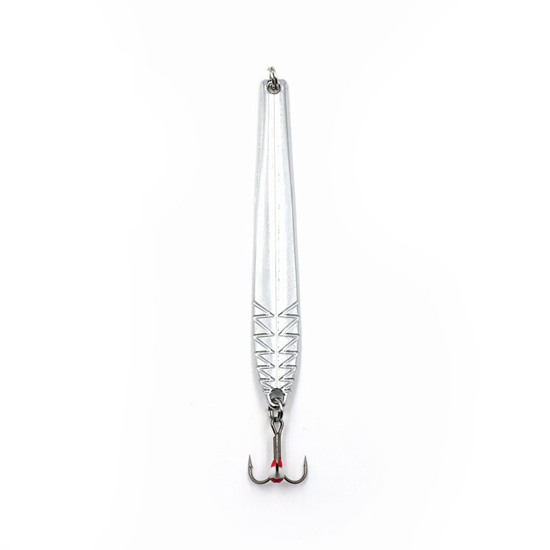У блесны узкая вытянутая пластина, в лицевой части чуть изогнутая. Такая форма обуславливает соблазнительную выразительную игру: приманка красиво покачивается и отклоняется в сторону от вертикали на подбросах различной интенсивности. Блестящая поверхность пластины при попадании света заманчиво бликует. Спереди в нижней части есть фигурное рифление.