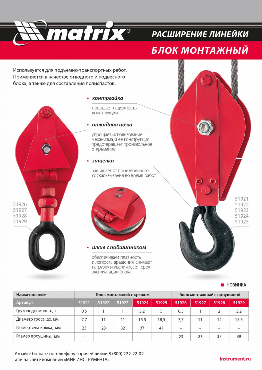 Монтажный блок Matrix 51922 с крюком, грузоподъемностью 1 т, расширяет функциональные возможности ручного и электрического грузоподъемного оборудования. Позволяет менять направление движения груза, а также увеличивает подъемную силу.