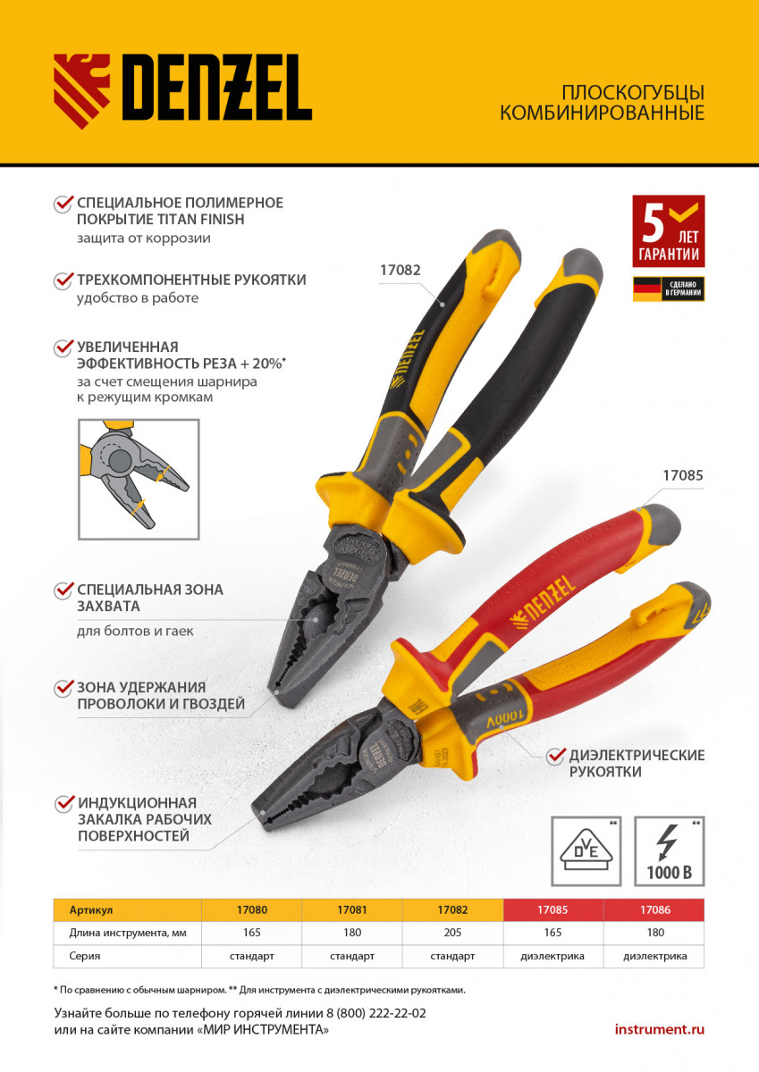 Бокорезы Denzel 17780 длиной 145 мм, с трехкомпонентными рукоятками, предназначены для разрезания кабелей из алюминия и меди, а также проволоки и стяжек. Максимальный диаметр перерезаемой мягкой проволоки (алюминиевой, медной, с пределом прочности 220 Н/мм2) составляет 5 мм, проволоки средней жесткости и гвоздей (750 Н/мм2) — 2,5 мм, жесткой (1800 Н/мм2) — 1,7 мм. Бокорезы используются для проведения слесарных и монтажных работ. Шарнир смещен к режущим кромкам, что позволяет сэкономить 20% усилий и максимально эффективно решать поставленные задачи.