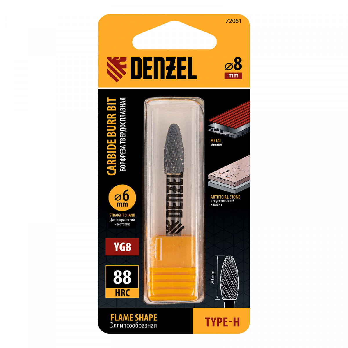Твердосплавная борфреза Denzel 72061 с эллипсообразной рабочей частью (тип H), диаметром 8 мм, — оснастка для дрели и прямошлифовальной машины, предназначенная для выполнения работ по металлу. Эффективно обрабатывает нержавеющую и закаленную сталь, чугун, титан, бронзу, медь, латунь, а также металлокерамику и искусственный камень. Пламевидная режущая часть удобна для шлифовки деталей сложной формы. Борфреза подходит также для восстановления гравировки.