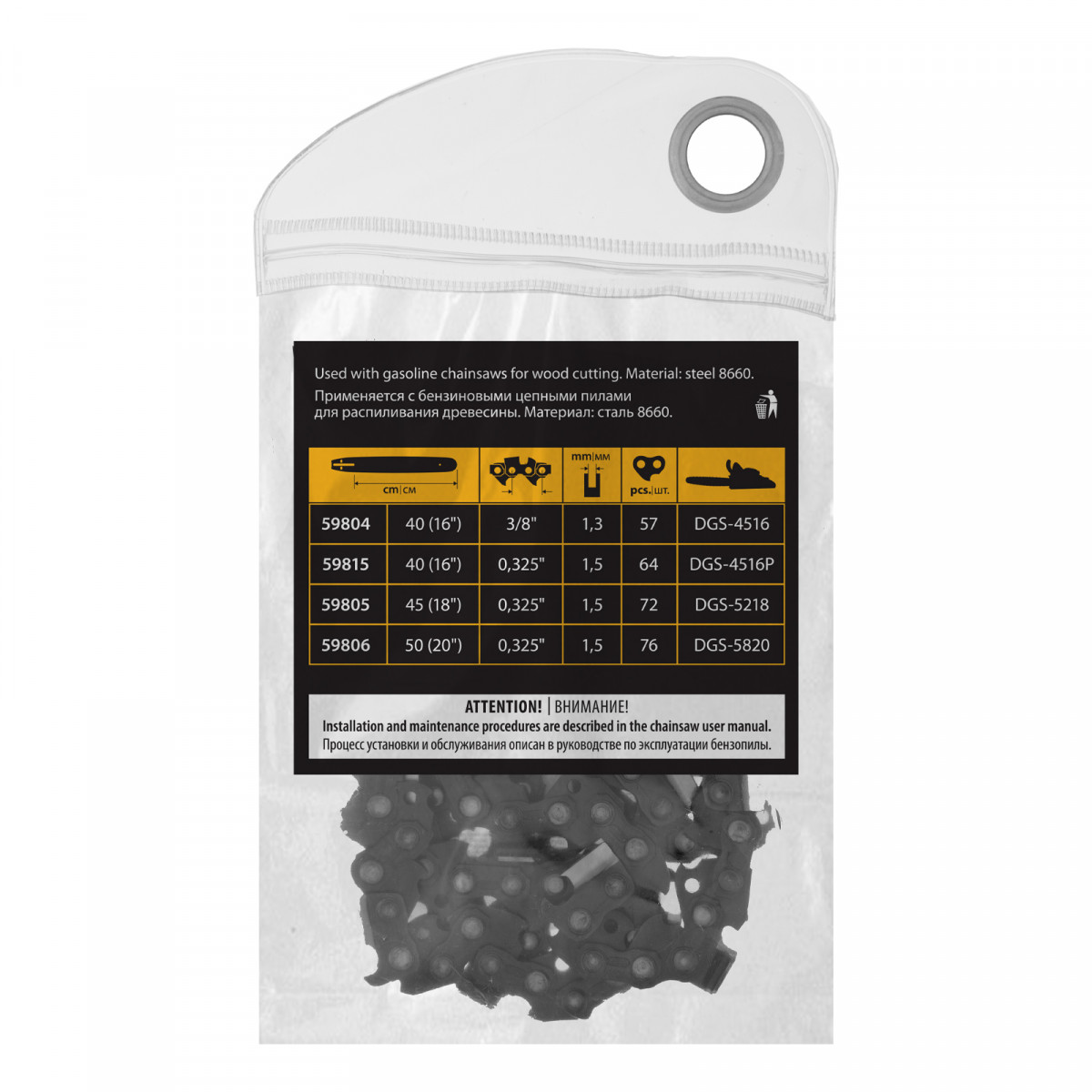 • Безопасное хранение и транспортировка — защитная упаковка предотвращает случайный контакт с острыми звеньями цепи.