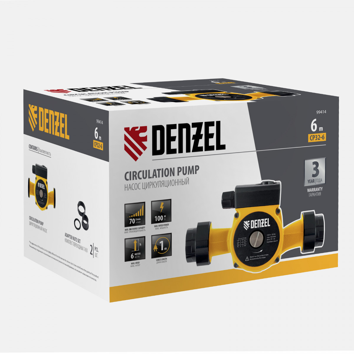 Циркуляционный насос CP32-6, напор 6 м, 70 л/мин, 1 м кабель, монт. длина 180 мм Denzel