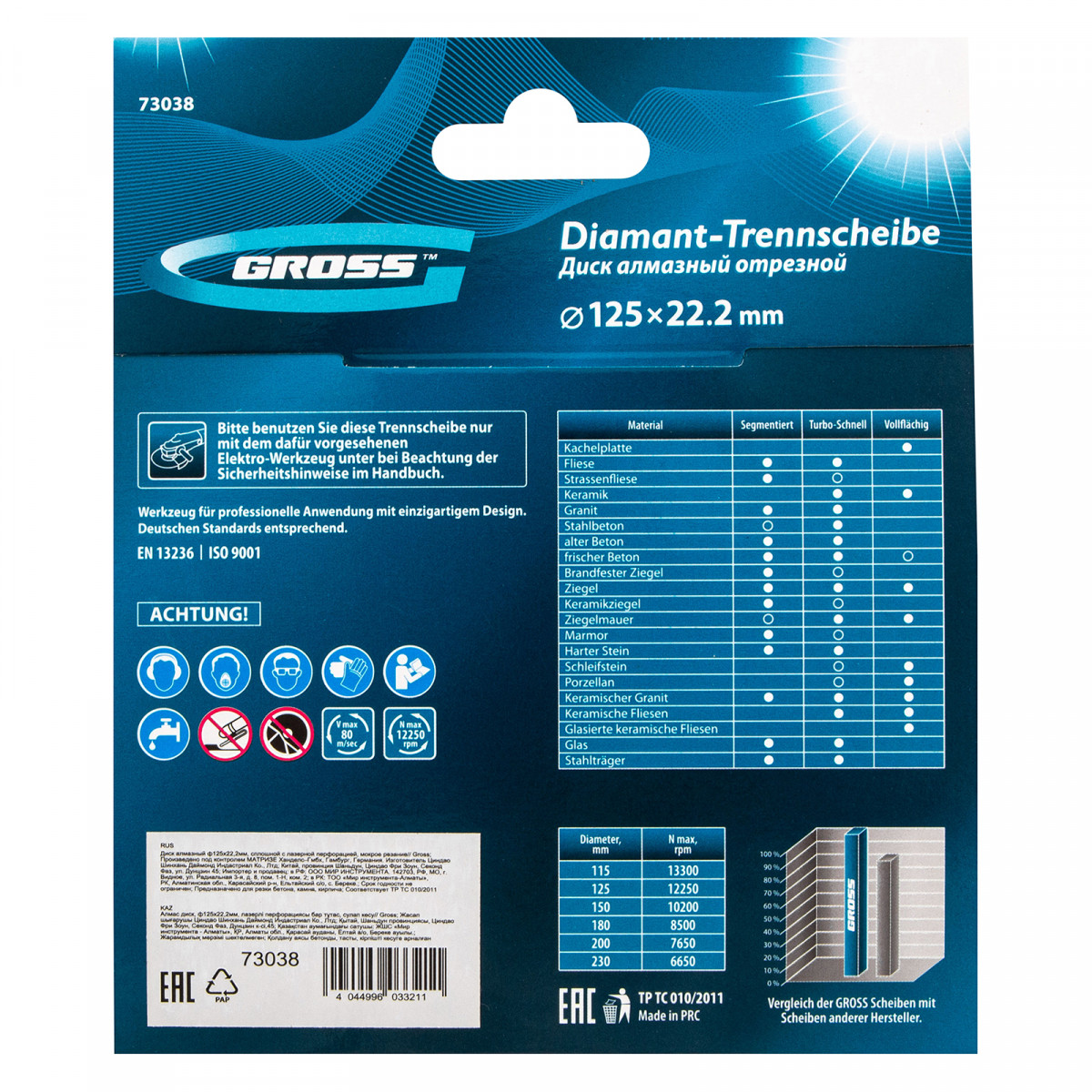 Сплошной алмазный диск Gross ф125 х 22,2 мм 73038 с лазерной перфорацией, для мокрого резания, используется в качестве расходника на УШМ или плиткорезах с посадочным размером 22,2 мм. Оптимальное соотношение серебра, кобальта и других качественных компонентов в металлической связке позволяет работать с гранитом, керамикой, керамогранитом, мрамором, натуральным и искусственным камнем. Метод мокрого шлифования подразумевает использование водяного охлаждения, что способствует снижению перегрева и эффективному отводу пыли.