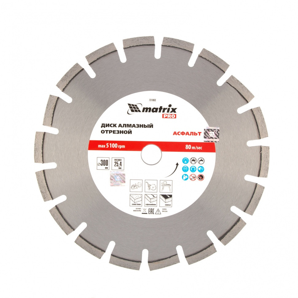 Алмазный диск Matrix PRO «Асфальт» 731063 диаметром 300 х 25,4 мм используется для сухого и мокрого реза асфальта, свежего бетона, асфальтобетона, камня, кирпича, абразивных материалов. Устанавливается на ручной бензорез или швонарезчик с посадочным диаметром 25,4 мм. Диск устойчив к деформациям и выдерживает значительные нагрузки. Для увеличения ресурса диска рекомендуется проводить мокрое резание.