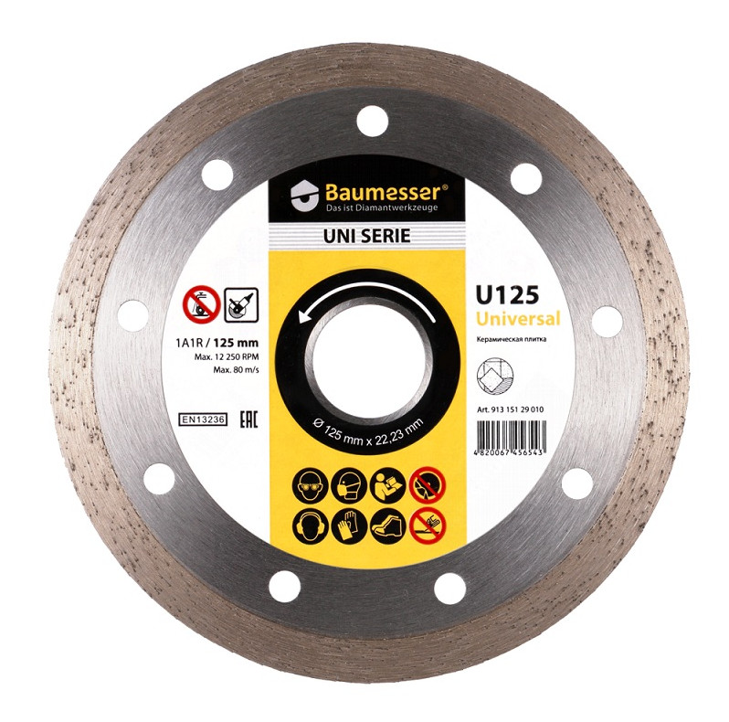 Алмазный круг Baumesser Universal 1A1R предназначен для обработки керамики, керамогранита и травертина. Диаметр диска равен 125 мм. Используется на базе угловых шлифовальных машин с посадочным отверстием 22,23 мм. Оборудован сплошной режущей кромкой высотой 8 мм и толщиной 1,4 мм. Применяется без подачи воды в рабочую зону (сухая резка).