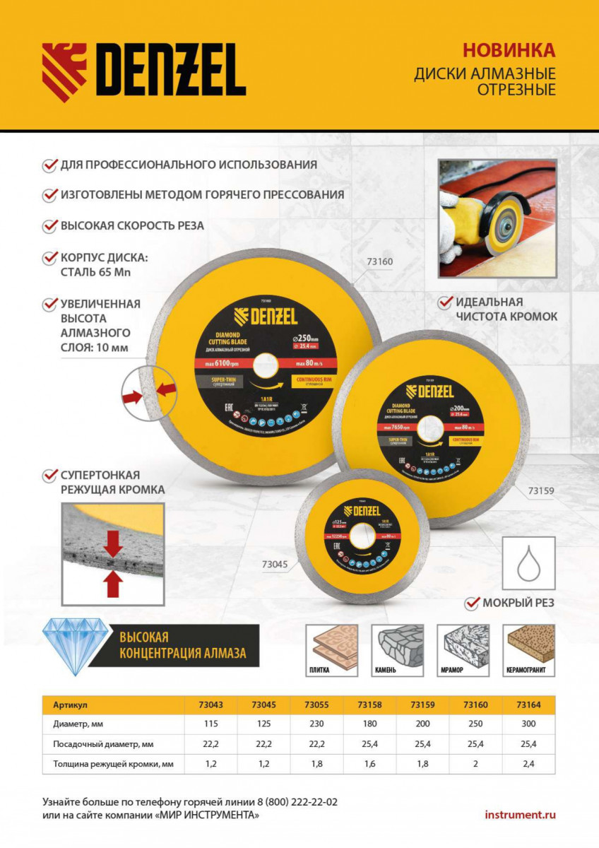 Алмазный диск ТМ Denzel "Сплошной" арт 73058, ф125 х 22,2 мм, предназначен для резания мрамора, керамогранита и керамическую плитки, камня. Устанавливается на УШМ (болгарку) или плиткорез с посадочным диаметром 22,2 мм. Высокая концентрация алмазов и супертонкая рабочая часть диска обеспечивает идеальную частоту кромок и высокую скорость реза.Особая сплошная форма режущей части позволяет использовать диск без водяного охлаждения для кратковременного реза.Диск произведен по технологии горячего прессования с увеличенной шириной режущей кромки (10мм) подходит для профессионального использования и больших объемов работ. При интенсивной резке необходимо использовать водяное охлаждение.