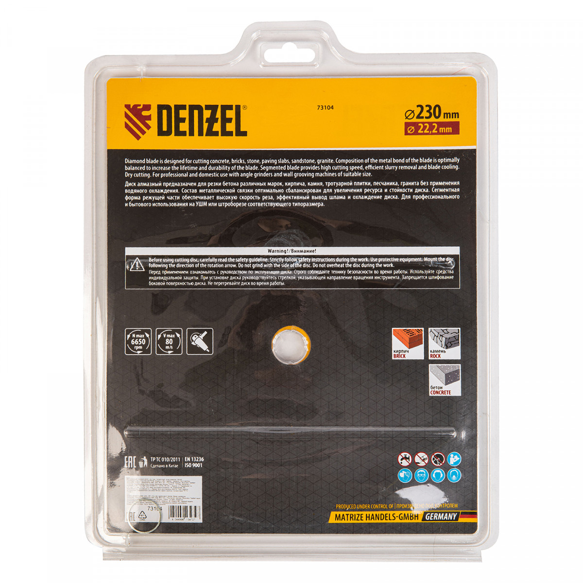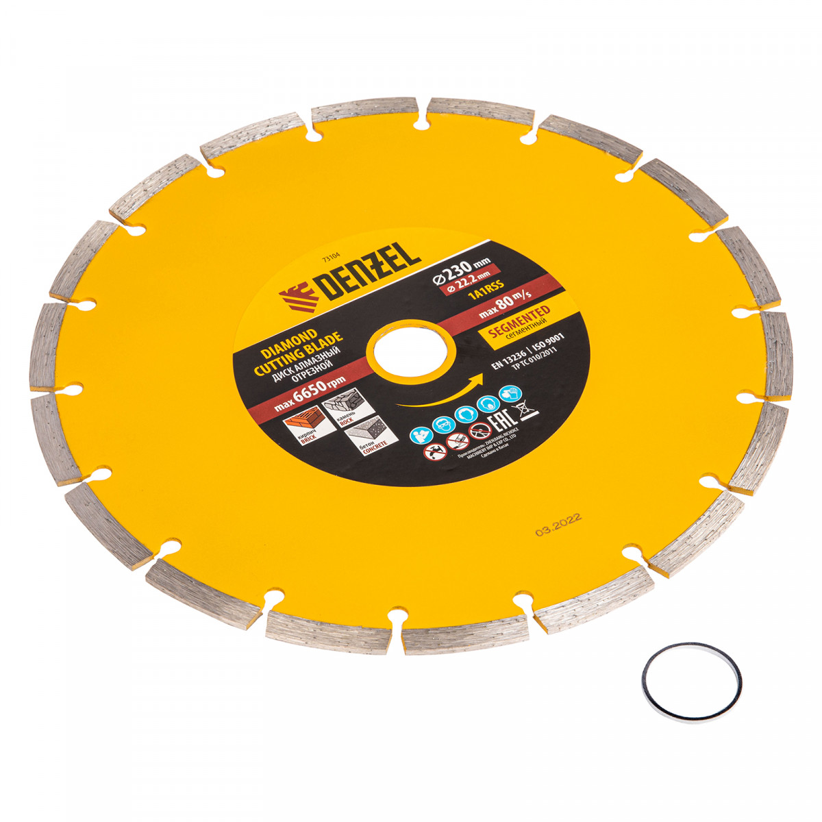 Отрезной сегментный алмазный диск Denzel 73104 диаметром 230 х 22,2 мм — оснастка для УШМ, использующаяся для сухой резки свежего и старого бетона, камня, кирпича, шлакоблока, мрамора, тротуарной плитки, гранита. Диск сегментного типа отличается высокой производительностью даже при интенсивных нагрузках. Подходит для бытового и профессионального использования.