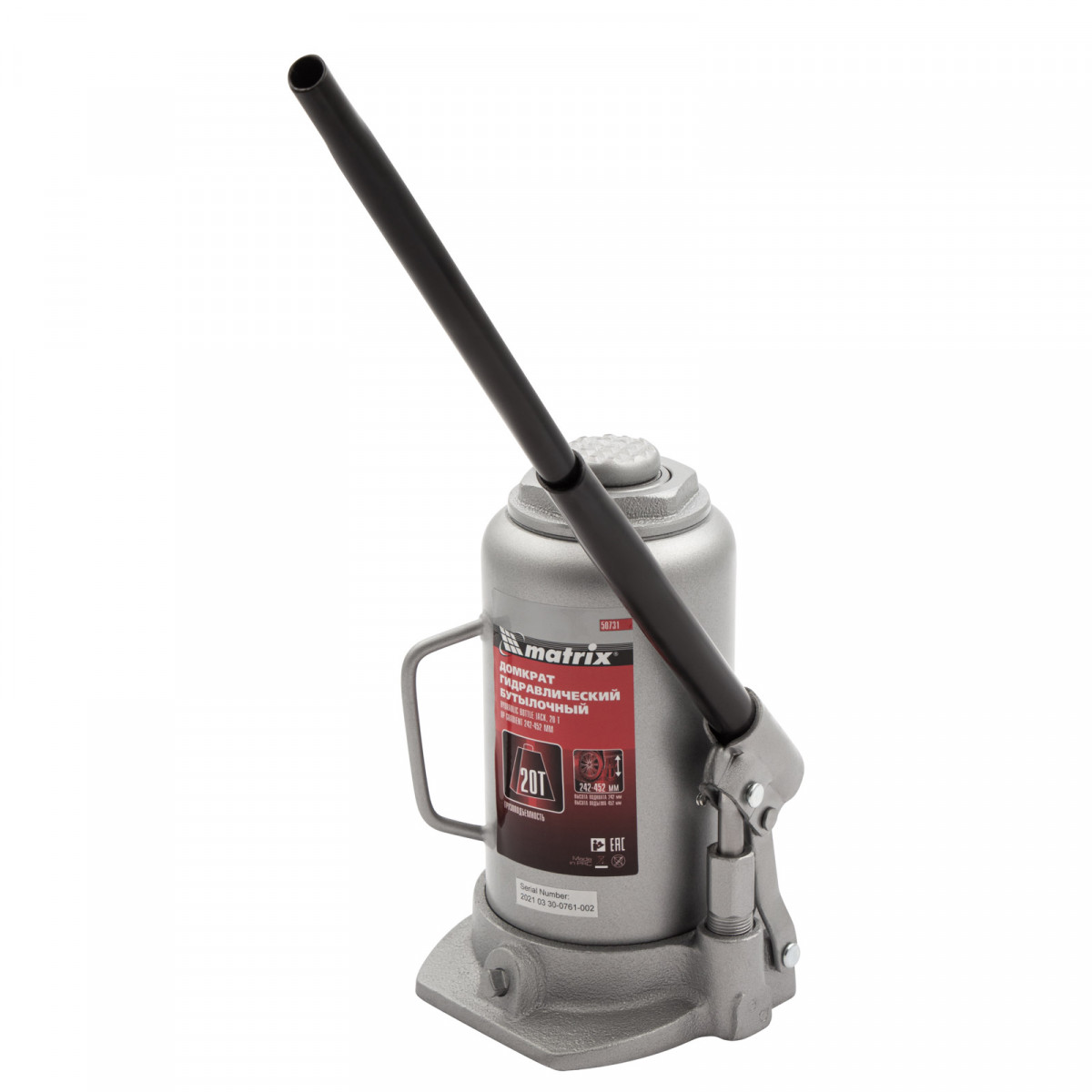 Домкрат гидравлический бутылочный, 20 т, высота подъема 242-452 мм Matrix