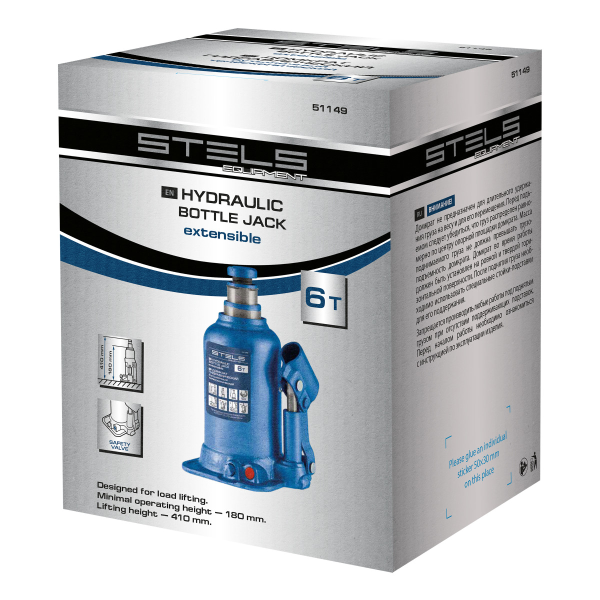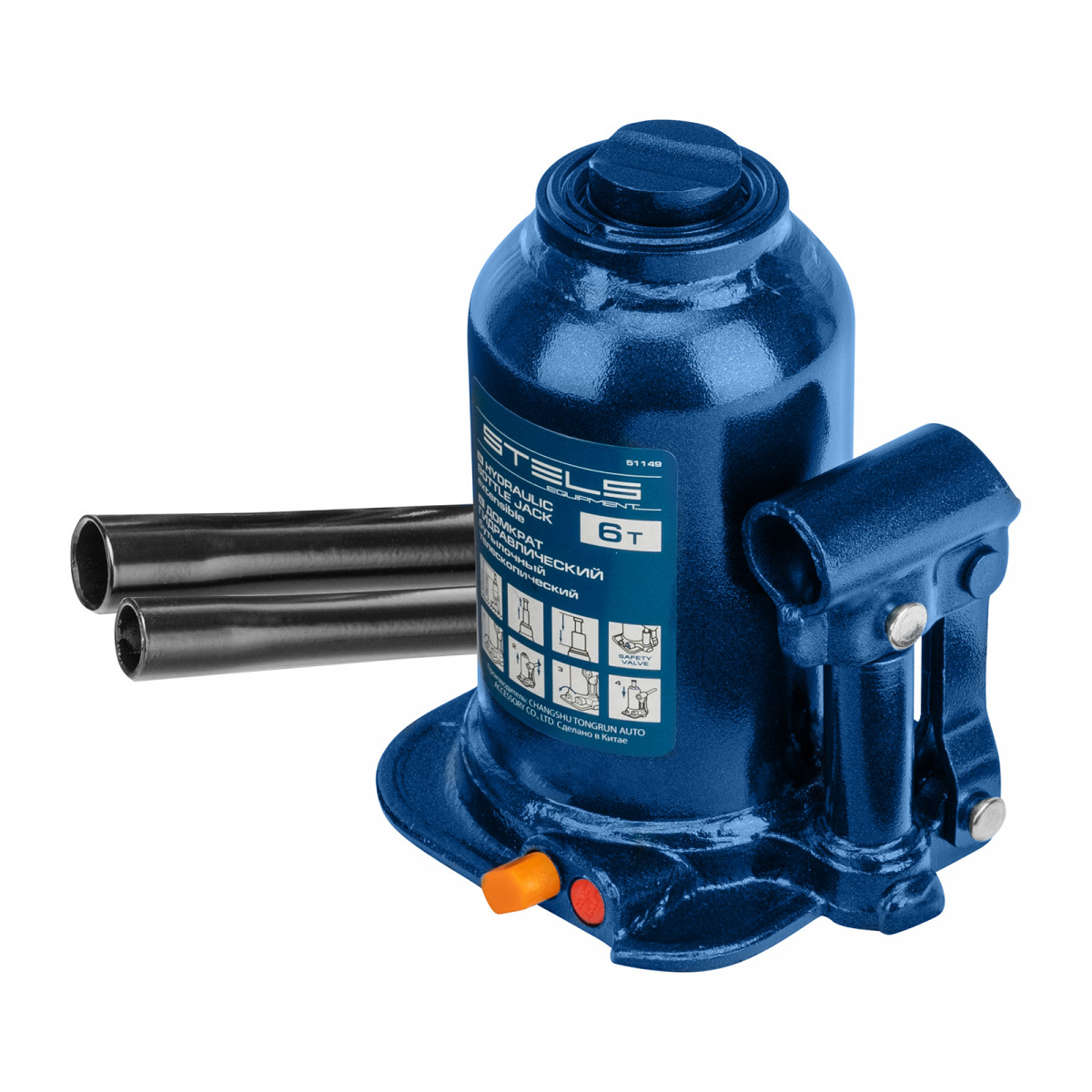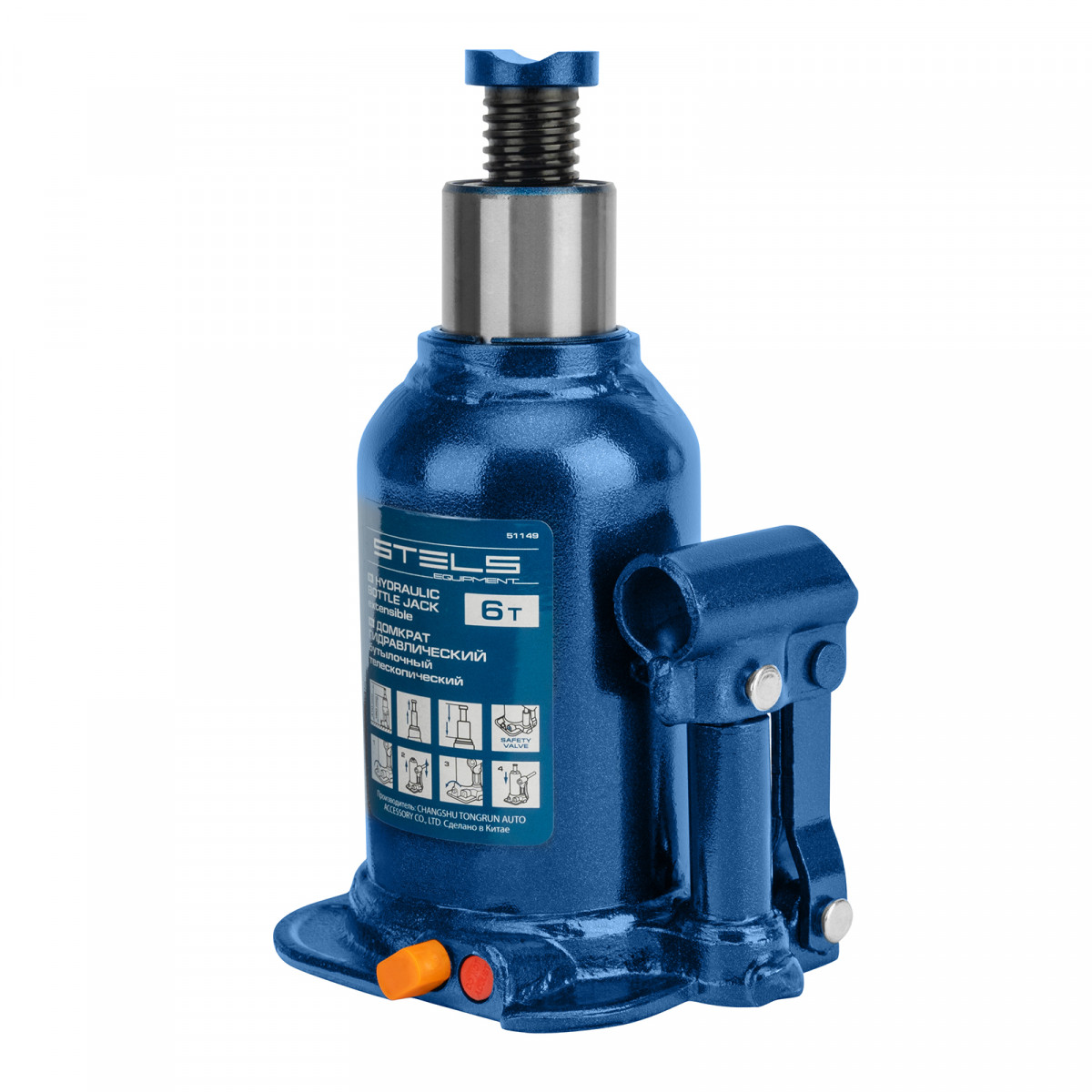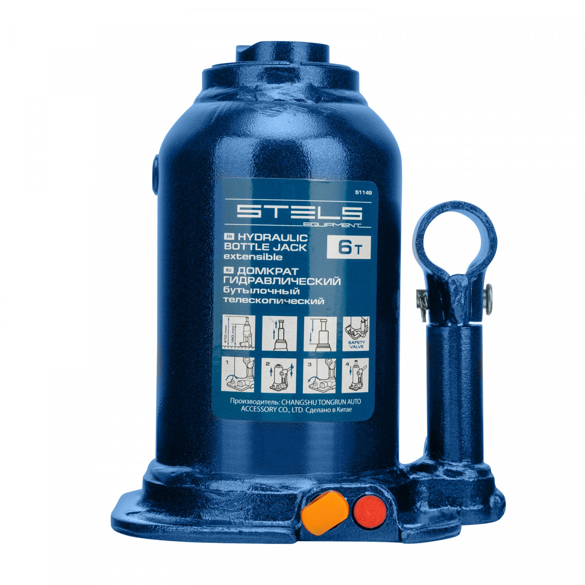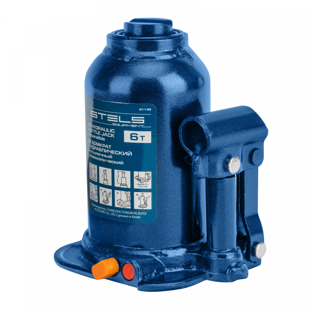 Домкрат гидравлический бутылочный Stels 51149, телескопический, используется для поднятия грузов весом до 6 т с на высоту 180-410 мм. Не требует больших усилий и оптимален для автомобилей с большим клиренсом. Домкрат можно использовать в гараже для самостоятельного ремонта машины или в автосервисе для решения профессиональных задач.
