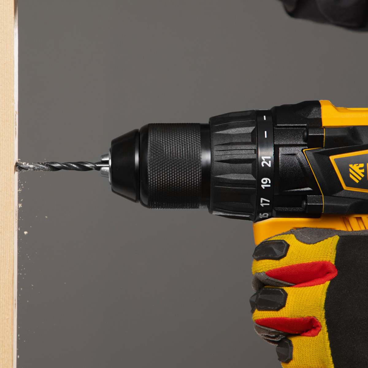 - Настройка крутящего момента — 21+1 ступень регулировки усилия затягивания позволяет подстроиться под размер крепежа и твердость материала.