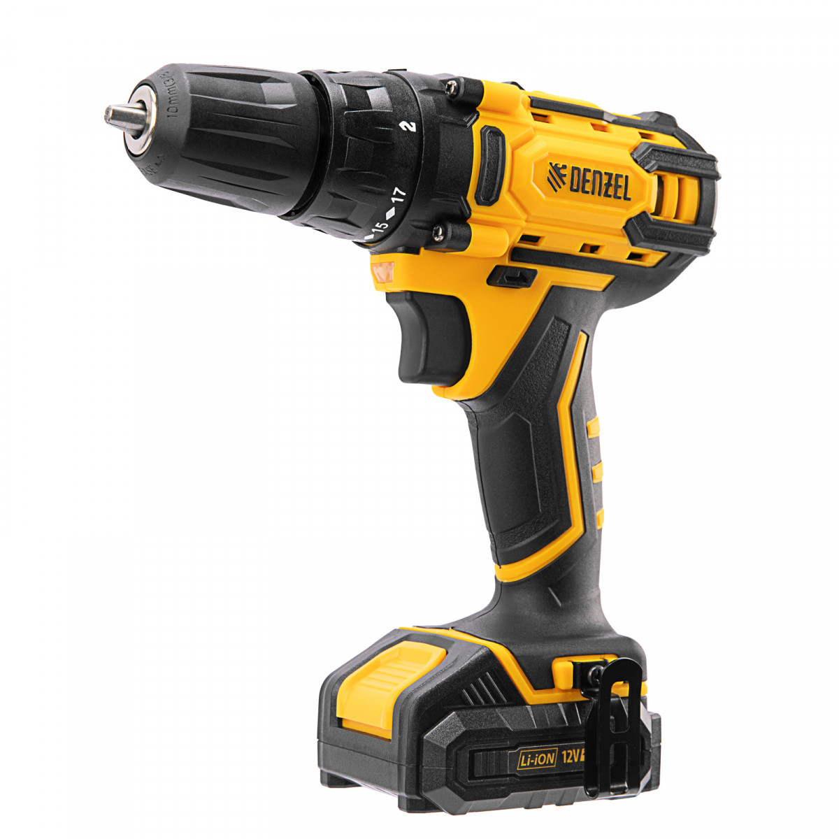 Аккумуляторная дрель-шуруповерт Denzel CDL-12-02BM 26105 с 2 батареями Li-Ion 12 В предназначена для монтажа и демонтажа резьбовых соединений, cверления отверстий в металле (до 10 мм), древесине (до 16 мм), пластмассе и других материалах. Инструмент пригодится профессионалам и любителям на строительной площадке, дома или на даче.,Надежные литий-ионные аккумуляторы без эффекта памяти и защитой от глубокого разряда обеспечивают долгий срок службы инструмента. Дрель не зависит от сети питания, что делает удобной работу на строительных объектах, на высоте и в отдаленных участках дома.