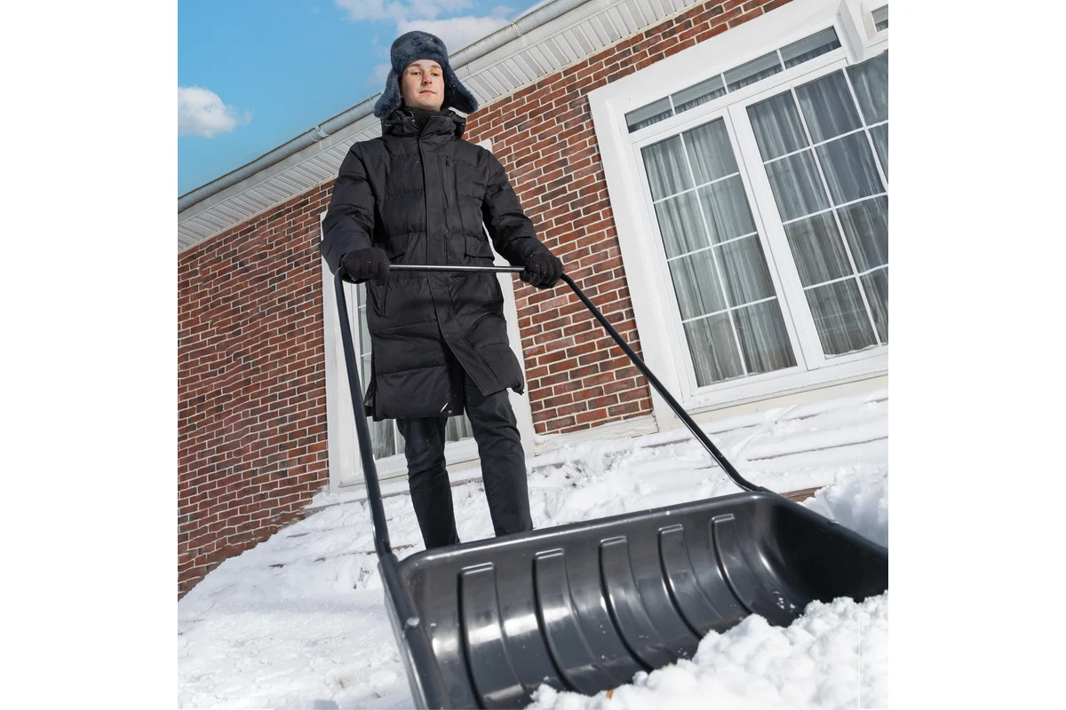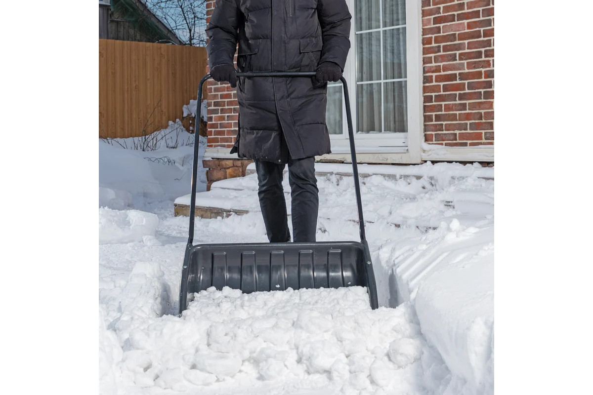 Движок для уборки снега со стальной рукояткой, позволяет быстро расчистить большую территорию, чем выгодно отличается от традиционной зимней лопаты. Углубленный ковш шириной 690 мм захватывает большое количество снега, упрощая и ускоряя работу. Движок будет полезен владельцам дачных участков и сотрудникам коммунальных служб. - Надежность — ковш из морозостойкого полипропилена выдерживает температуру до -20 °C. - Прочность — рукоятка изготовлена из среднеуглеродистой стали, ребра жесткости повышают устойчивость ковша к высоким нагрузкам. - Износостойкость — алюминиевая накладка защищает рабочую кромку от повреждений и истирания. - Эргономичность — П-образная рукоятка снижает нагрузку на позвоночник, позволяя выполнять большой объем работы без лишних усилий.