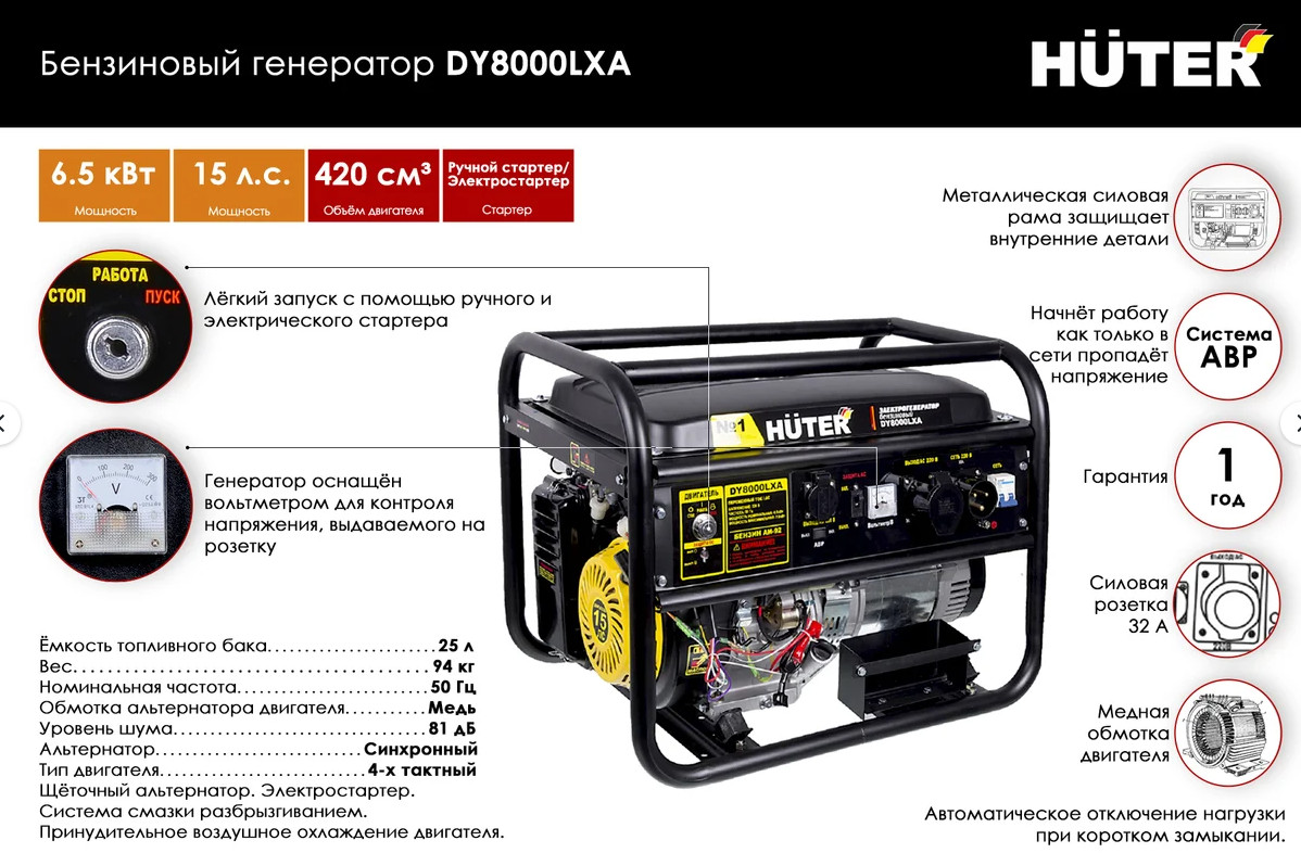 • HUTER DY8000LXA — портативное устройство, которое обеспечит электроснабжение вашего дома или рабочего помещения во время аварийных отключений на сетях. За счет автономности оборудование можно использовать в полевых условиях для подключения инструмента при проведении строительных и ремонтных работ.