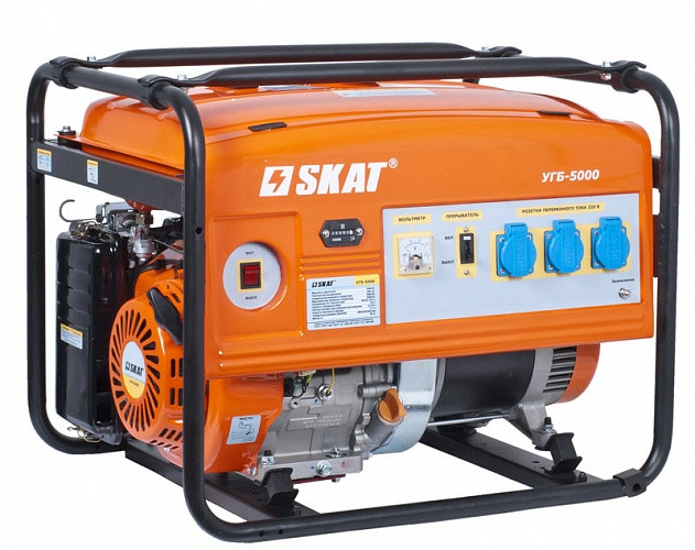 Генератор SKAT УГБ-5000Е способен обеспечить питанием мощные электроинструменты и бытовую технику. Мощности достаточно для постоянного использования на строительных площадках, в производстве, фермерских хозяйствах. Модель комплектуется электростартером для легкого запуска генератора. Газораспределительный механизм системы OHV четырехтактного бензинового двигателя открывает клапаны толкателями посредством коромысел. Этот простой и надежный механизм не имеет в конструкции ремня или цепи ГРМ и позволяет сделать двигатель более компактным и легким. Синхронный щеточный генератор производит стабильное напряжение высокого качества и способен выдерживать кратковременные перегрузки. Медная обмотка генератора в сравнении с алюминиевой обладает значительно большим рабочим ресурсом. Брызгозащищенные розетки позволяют использовать генераторную установку при различных погодных условиях. Свеча зажигания NGK® (Япония) и автоматический декомпрессор значительно облегчают пуск двигателя.