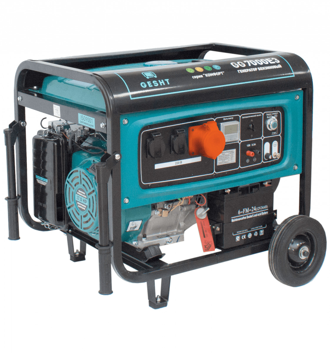 Дизельный генератор Gesht GD7500E3 поставляется с комплектом для транспортировки. Конструкция собрана максимально компактно, но с учетом требования безопасности: открытый корпус обеспечивает приток воздуха и не допускает перегрева оборудования. Старт генератора допускается только при повороте ключа, что не дает изделию запуститься автоматически. Розетки разделены по цвету: трехфазная закрыта красной крышкой, однофазная - черной. Имеется выход на 12 В.