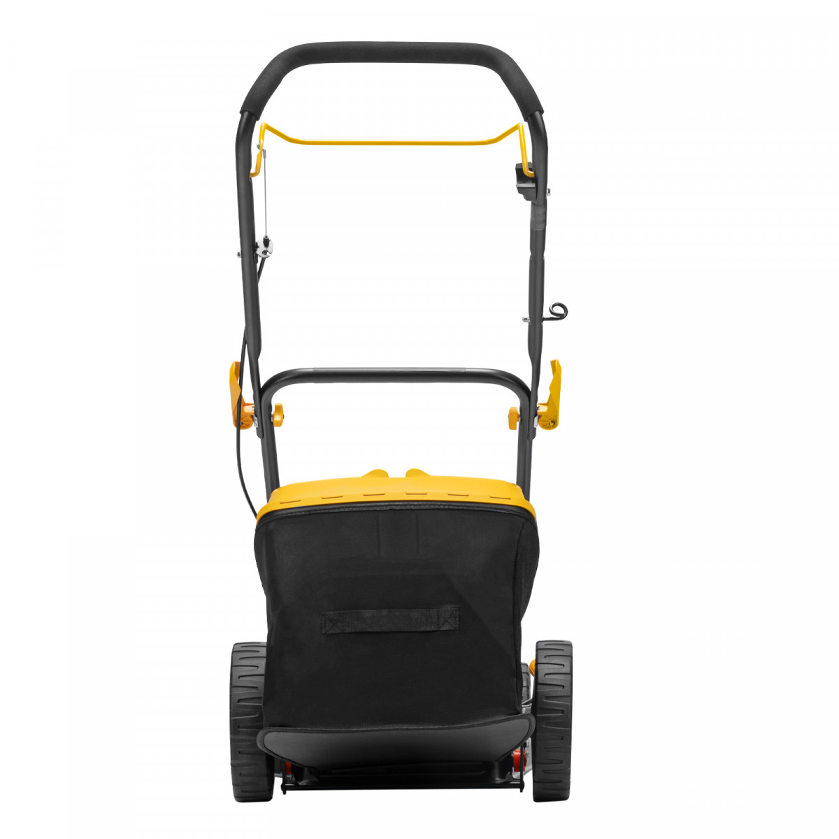- Высокая эффективность — усиленный стальной корпус, закаленный до твердости 45 HRC нож и колеса увеличенного диаметра обеспечивают лучшее втягивание травы и свободную проходимость без повреждения газона.