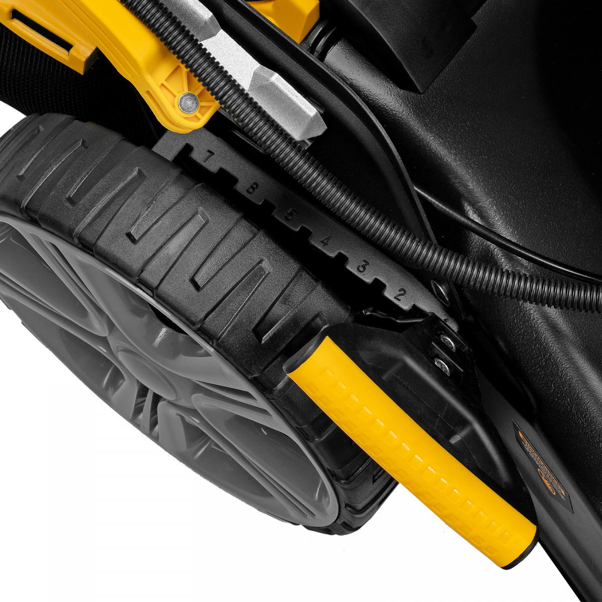 • Привод на колеса — достаточно только направлять косилку, ее не нужно постоянно толкать.