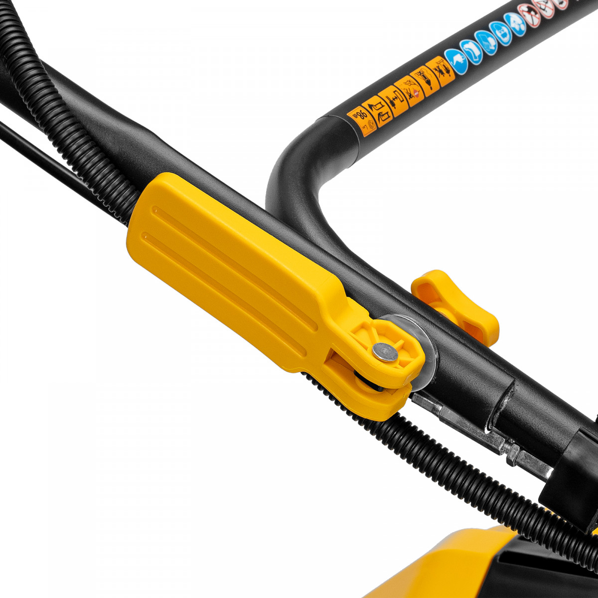 • Регулировка скорости движения — низкая частота вращения колес оптимальна для скашивания густой травы и работы на ограниченном участке, высокая — для подстригания редко растущей и молодой травы.