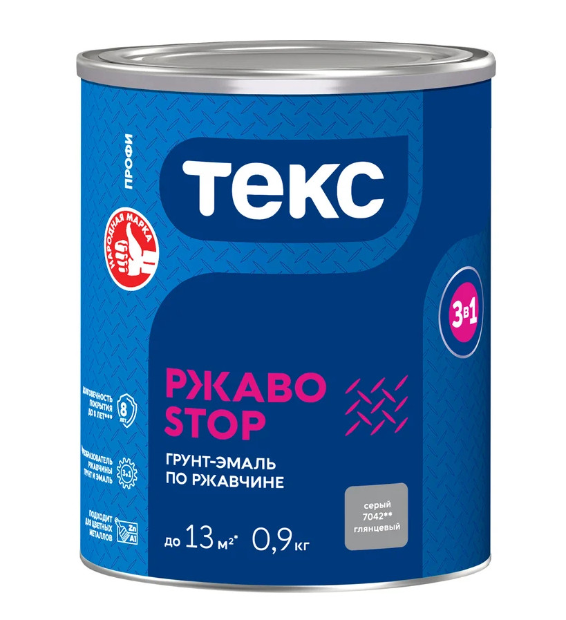 Грунт-эмаль 3в1 РЖАВОSTOP ПРОФИ серая глянцевая 0,9кг ТЕКС