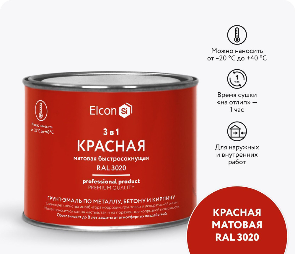 Грунт-эмаль по ржавчине 3в1 Элкон матовая красная RAL 3020 0,8 кг