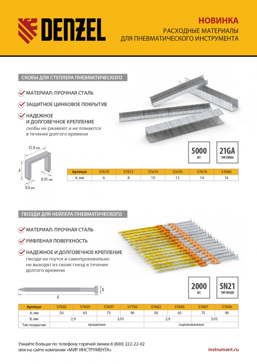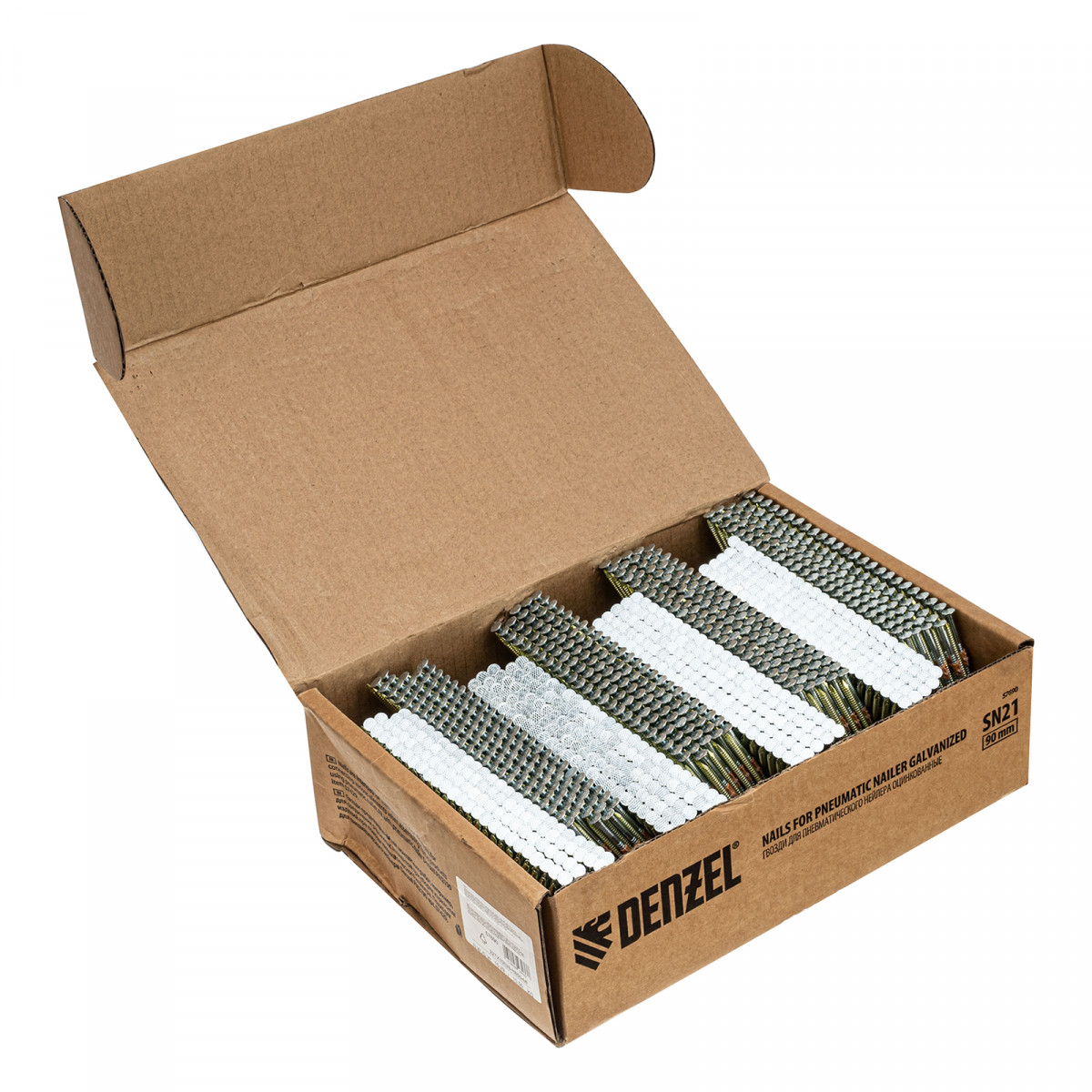 Оцинкованные гвозди Denzel 57690 типа SN21, длиной 90 мм и диаметром 3,05 мм, 2000 шт. в упаковке, — расходники для пневматического нейлера. Используются для скрепления различных материалов, будут полезны во время сборочных и отделочных работ.