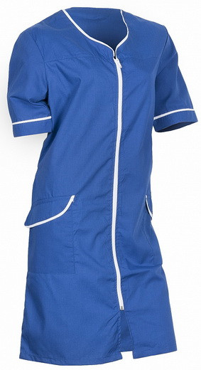 Халат на молнии полуприталенного силуэта с короткими рукавами изготавливается из смесовых тканей. Горловина, клапаны карманов и рукава декорируются контростным кантом.
