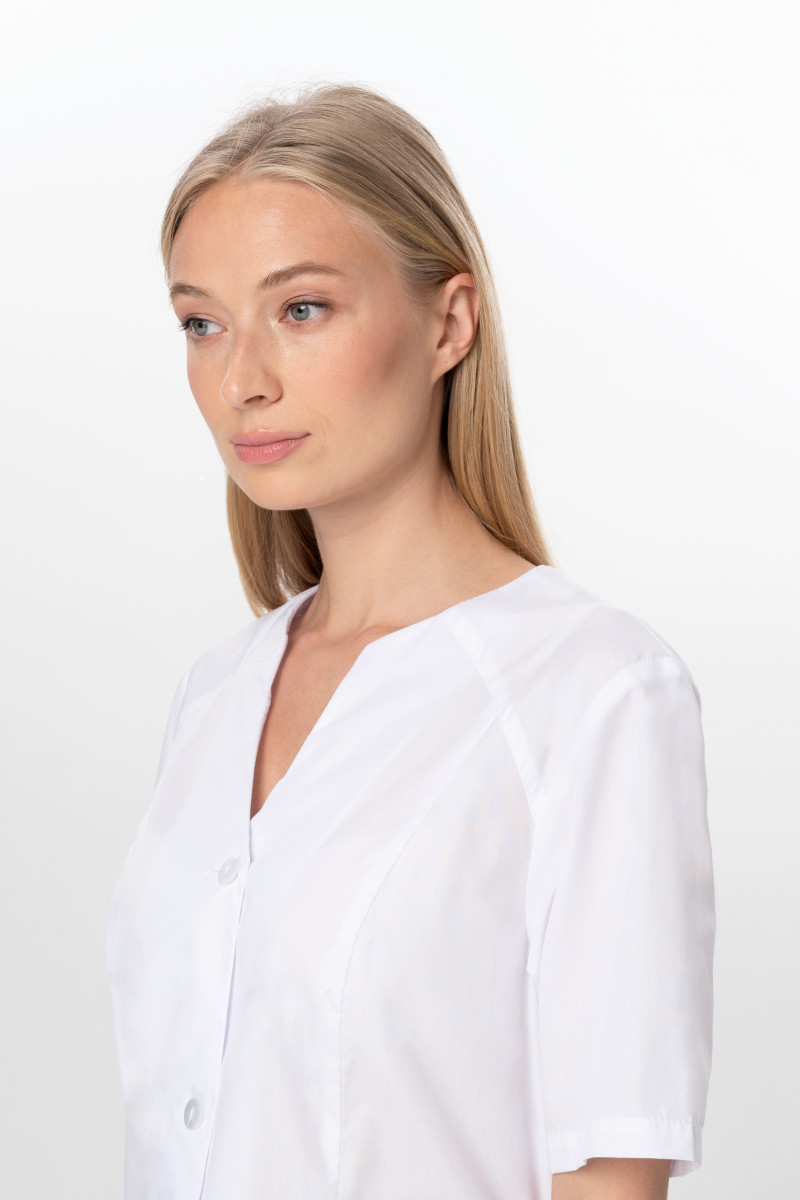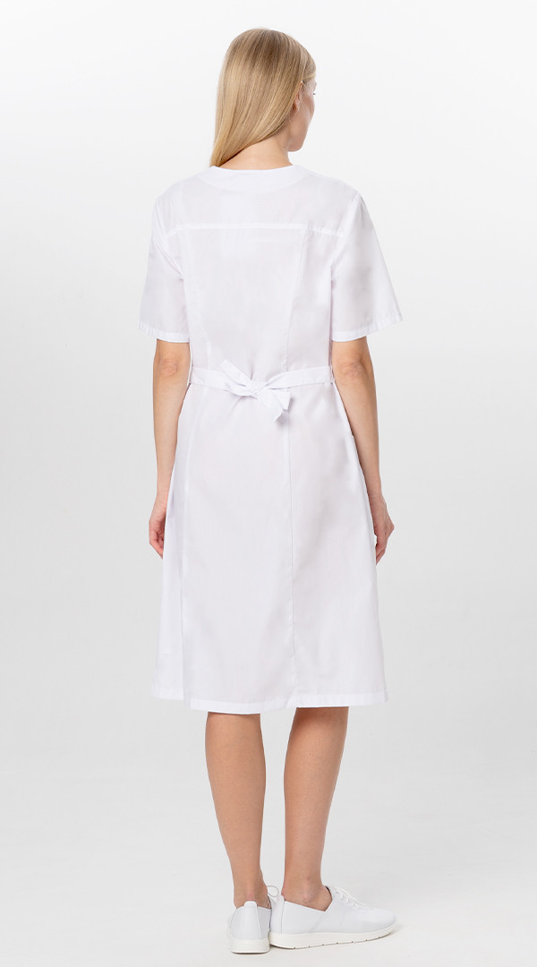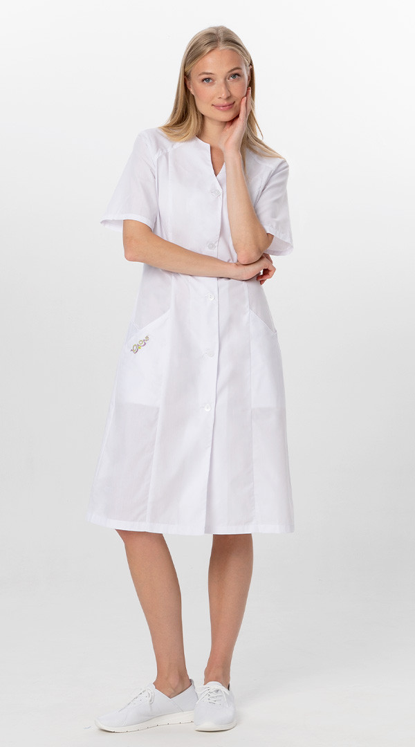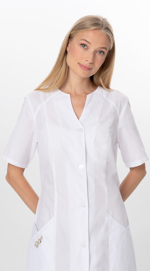 Халат: - полуприлегающий силуэт; - центральная застёжка на петли и пуговицы - на кокетке; - рельефные швы на полочке и спинке; - горловина фигурной формы; - рукав короткий; - накладные карманы с вышивкой в шве деталей полочки; - хлястик на спинке. Цвет: белый Ткань: «Тиси» Состав: 65% п/э, 35% х/б, пл. 120 г/м