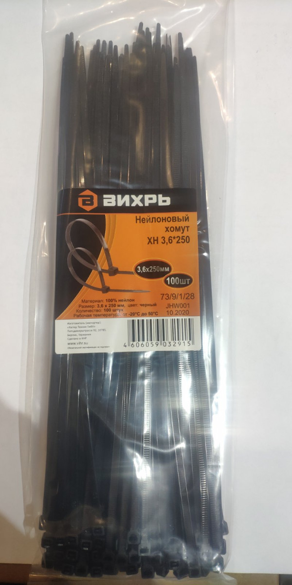 Хомут нейлоновый 4,8*250 черный (100шт) Вихрь