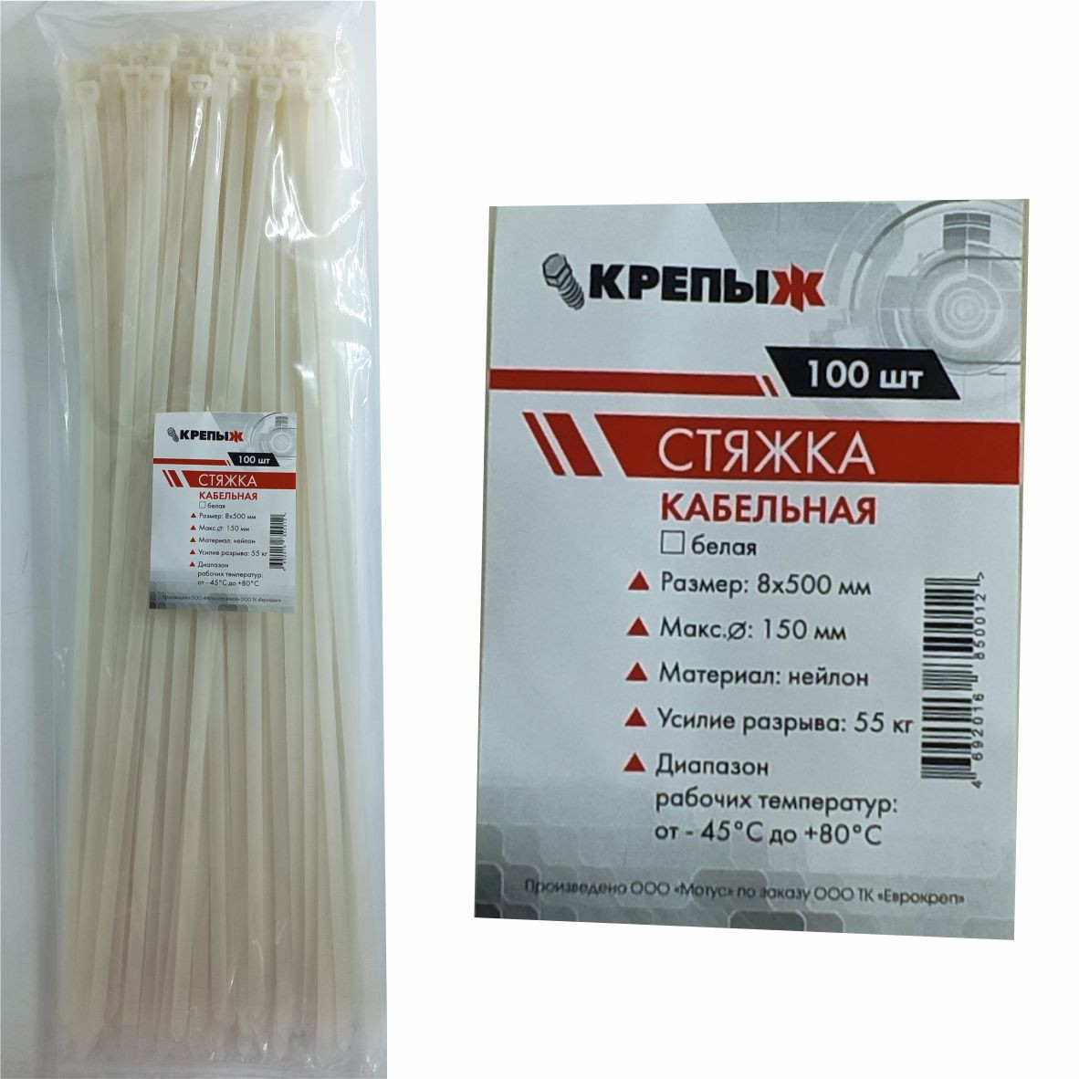 Хомут нейлоновый 8*500 мм белый КРЕПЫЖ