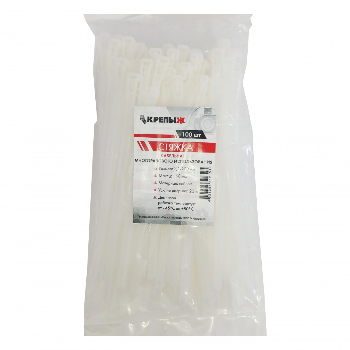Хомут нейлоновый многоразовый 7,2*200 мм белый КРЕПЫЖ