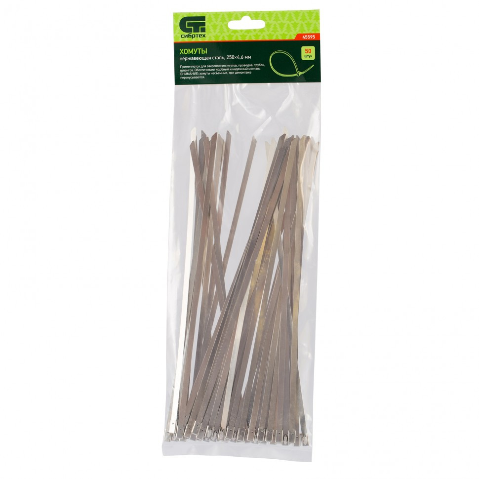 Хомуты Сибртех 45595 из нержавеющей стали, размером 250 х 4,6 мм, 50 шт. в упаковке, предназначены для стяжки и закрепления проводов, жгутов, трубок и шлангов. Пригодятся во время монтажа электросетей, а также будут полезны дома, на даче или в гараже.