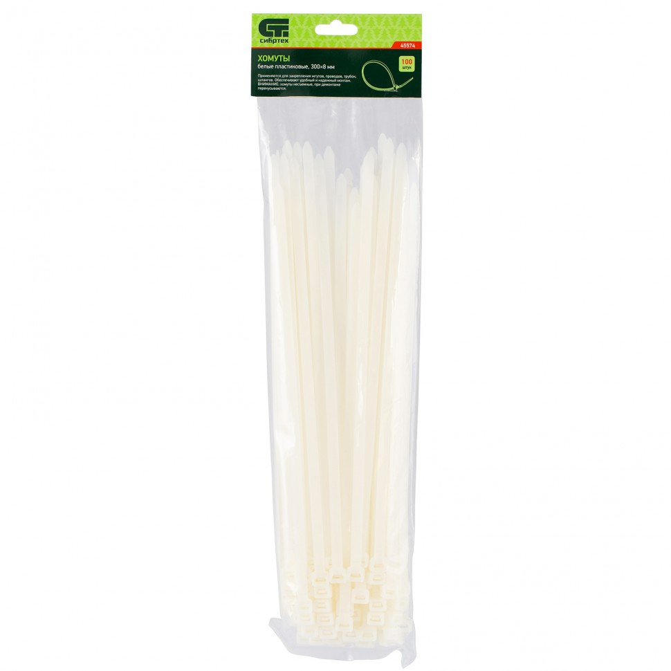 Белые пластиковые хомуты Сибртех 45574, 300 х 8 мм, 100 шт. в упаковке, используются для стяжки кабелей, закрепления трубок, шлангов, рекламных конструкций, а также для упаковки различных предметов. Пригодятся во время прокладки электрических и локальных вычислительных сетей, ремонта компьютерной техники, оформлении торговых стендов, комплектовании товара, будут также полезны дома, на даче и в гараже.