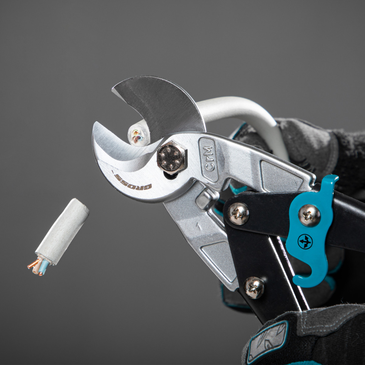 Кабелерез Gross «PIRANHA» 78450 длиной 240 мм, с двухкомпонентными рукоятками, используется для перерезания одножильных и многожильных кабелей диаметром до 14 мм и сечением до 14 кв. мм. Он пригодится частным мастерам и профессионалам при выполнении электромонтажных работ.