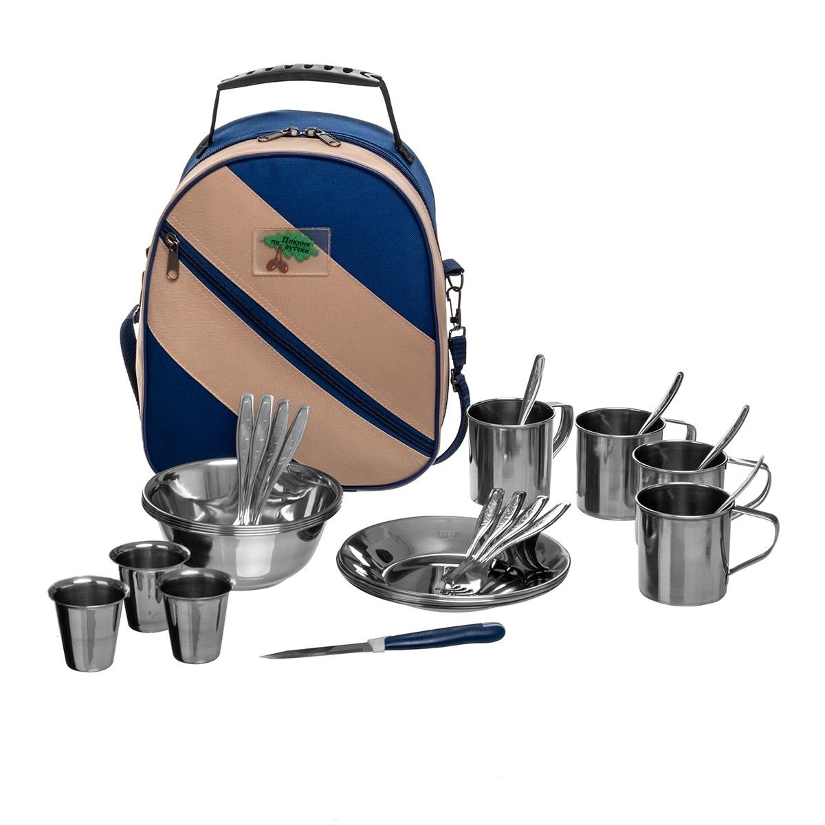 В комплект набора входят все разновидности посуды из нержавеющей стали, чтобы полноценно «накрыть стол» для 4 человек. В общей сложности в специальный небольшой кейс удобно и компактно убирается 29 предметов. Прекрасный подарок для любителей отдыхать на природе. Очень практичная вещь для больших и маленьких путешествий семьей или компанией. КОМПЛЕКТАЦИЯ • Кружка Ø 7 см/высота 8 см: 4 шт; • Стаканы Ø 7 см/высота 11 см: 4 шт; • Стопка Ø 6 см/высота 6 см: 4 шт; • Тарелка Ø 20 см: 4 шт; • Миска глубокая Ø 16 см/глубина 6 см: 4 шт; • Ложка столовая: 4 шт; • Вилка: 4 шт; • Ложка чайная: 4 шт; • Нож: 1 шт.
