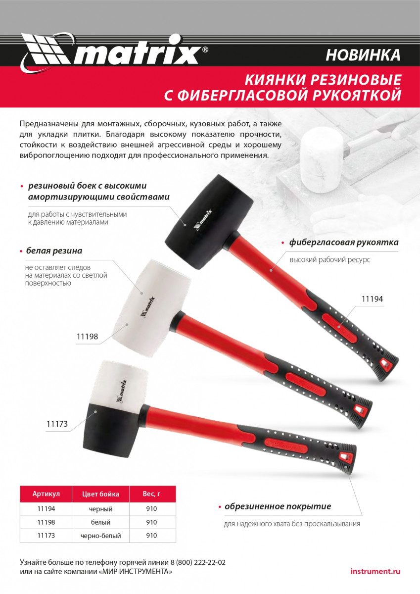 Киянка резиновая, 910 г, черно-белая резина, фибергласовая рукоятка Matrix