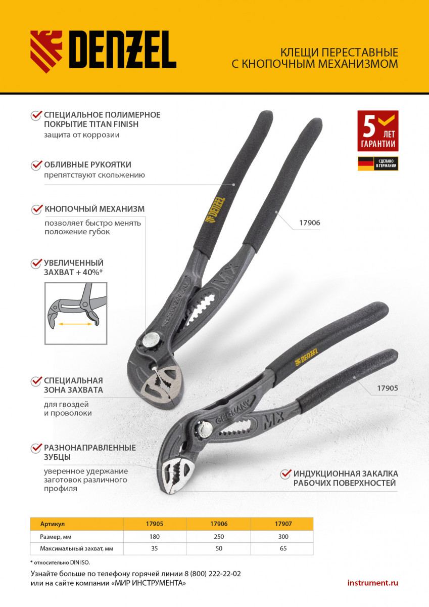 Переставные клещи Denzel 17906 длиной 250 мм, с обливными рукоятками и кнопочным механизмом, предназначены для фиксации и вращения деталей и заготовок различной формы. Подходят для захвата фитингов, труб, крепежных элементов. Инструмент удобен для работы в труднодоступных местах, используется при проведении ремонтных, монтажных, сантехнических работ.