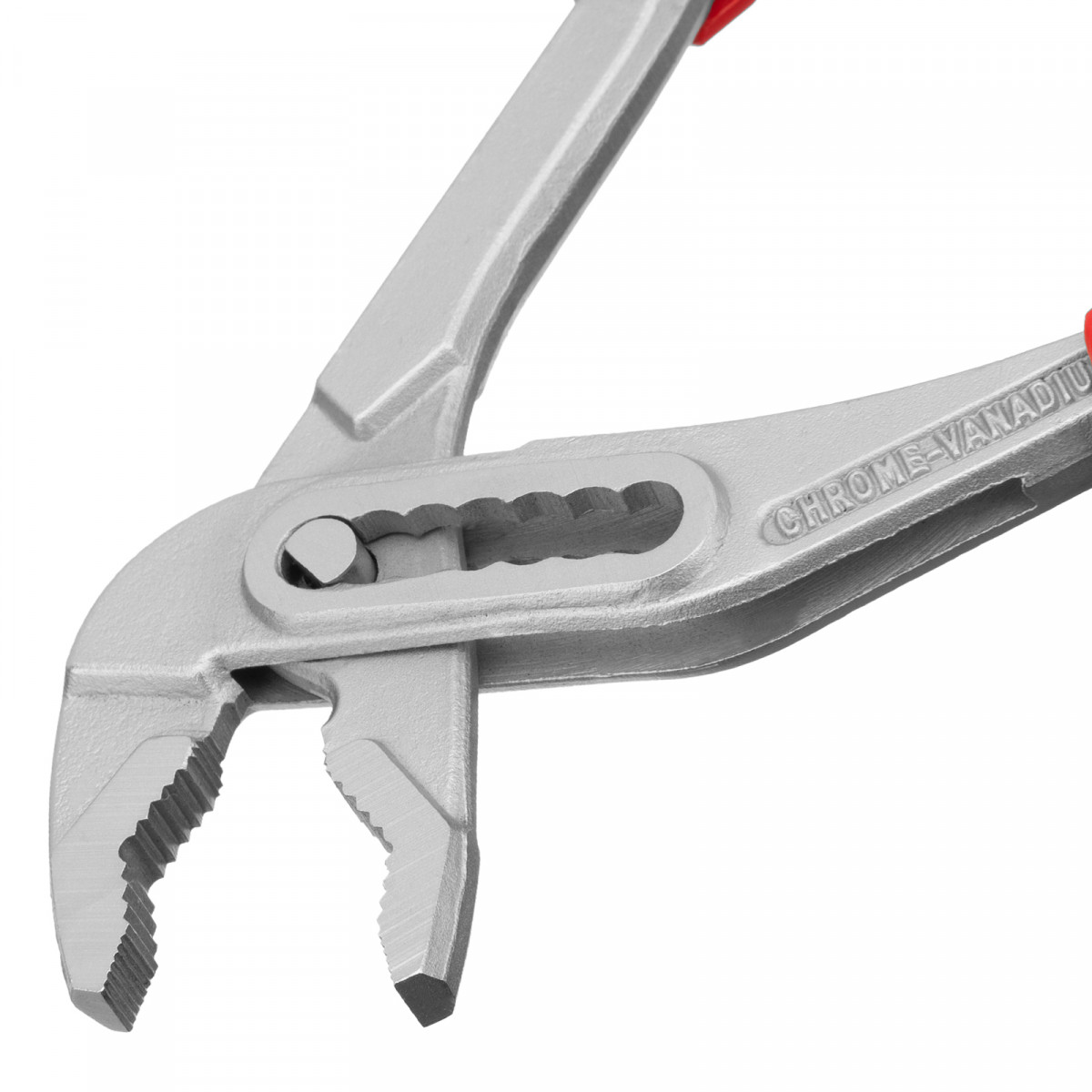 Переставные клещи Matrix Nickel 15701 длиной 250 мм, с покрытием белого цвета, выполненные из хром-ванадия, с двухкомпонентными рукоятками, используются для проведения монтажных и слесарных работ. Универсальный инструмент заменяет ключи различных размеров и применяется для фиксации заготовок, откручивания гаек, зажима и удержания труб и деталей.
