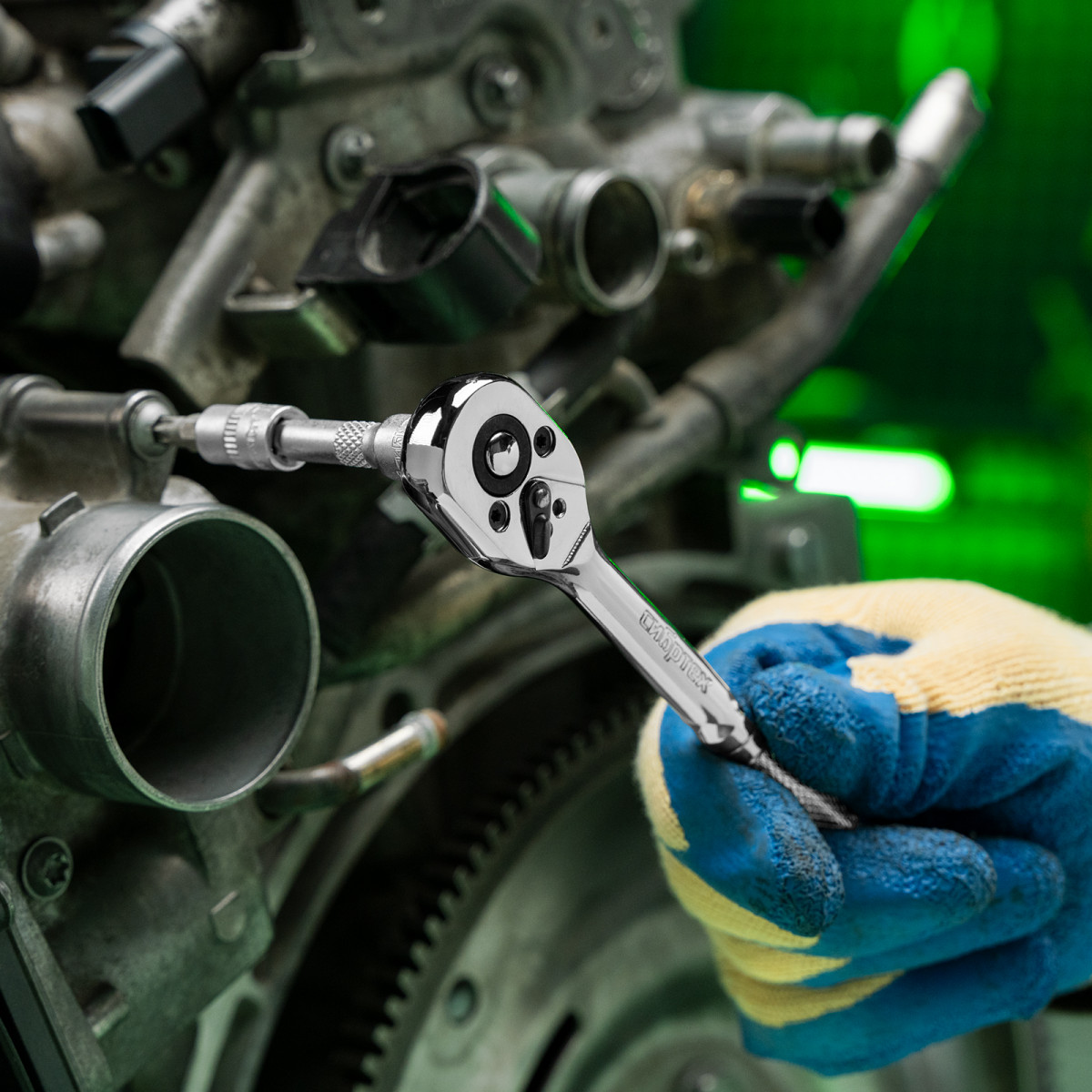 • Надежная фиксация — шариковый замок крепко удерживает торцевую головку, поэтому она не соскочит во время работы.
