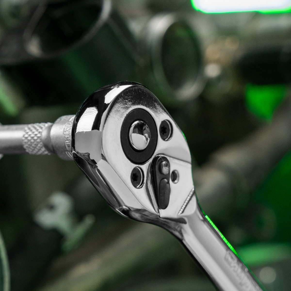 • Функция реверса — при помощи переключателя с металлическим флажком можно одним движением изменить направление вращения трещотки.