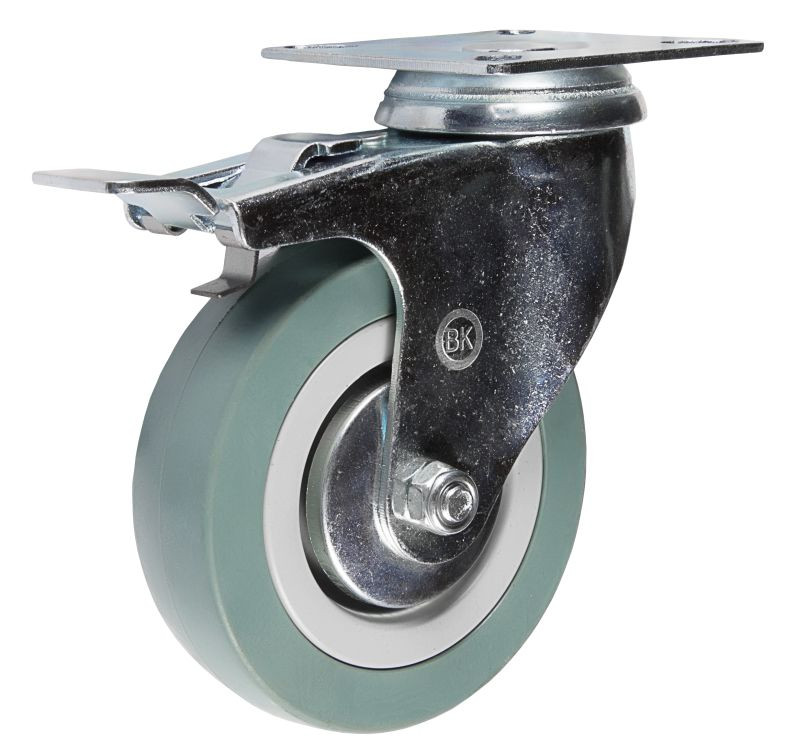 Колесные опоры аппаратные поворотные с тормозом, серая резина, полипропиленовый обод, платформенное крепление, подшипник скольжения.