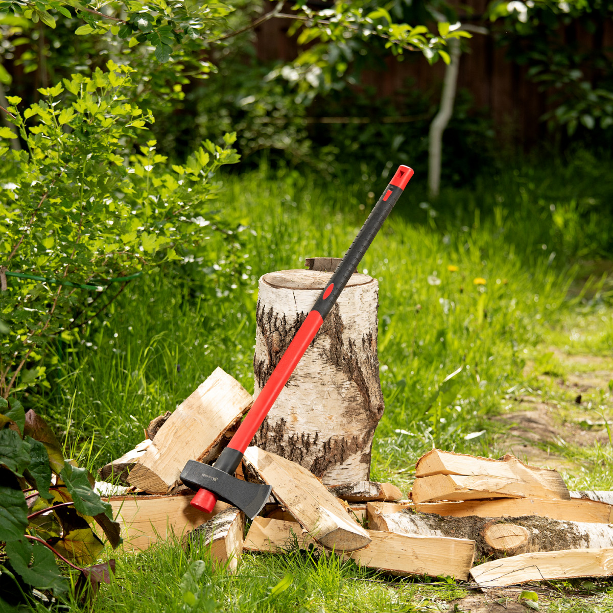 - Большая сила удара — колун оснащен длинной рукояткой 900 мм, полотно весит 2,7 кг.