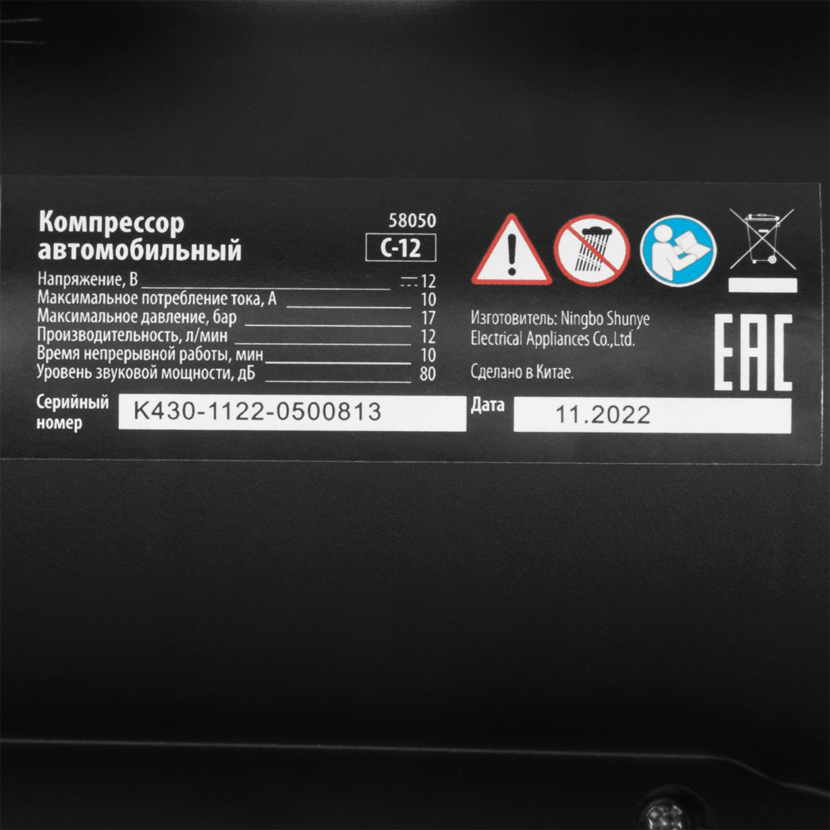 Автомобильный компрессор Sparta C-12 58050 производительностью 12 л/мин обеспечивает давление до 17 атмосфер и питается от прикуривателя 12 В. Используется для накачки шин, а также мячей, матрасов, лодок и другого инвентаря. Компрессор поршневого типа способен накачать колесо R16 за 10 минут. Устройство пригодится в поездке, на даче, во время отдыха на природе.