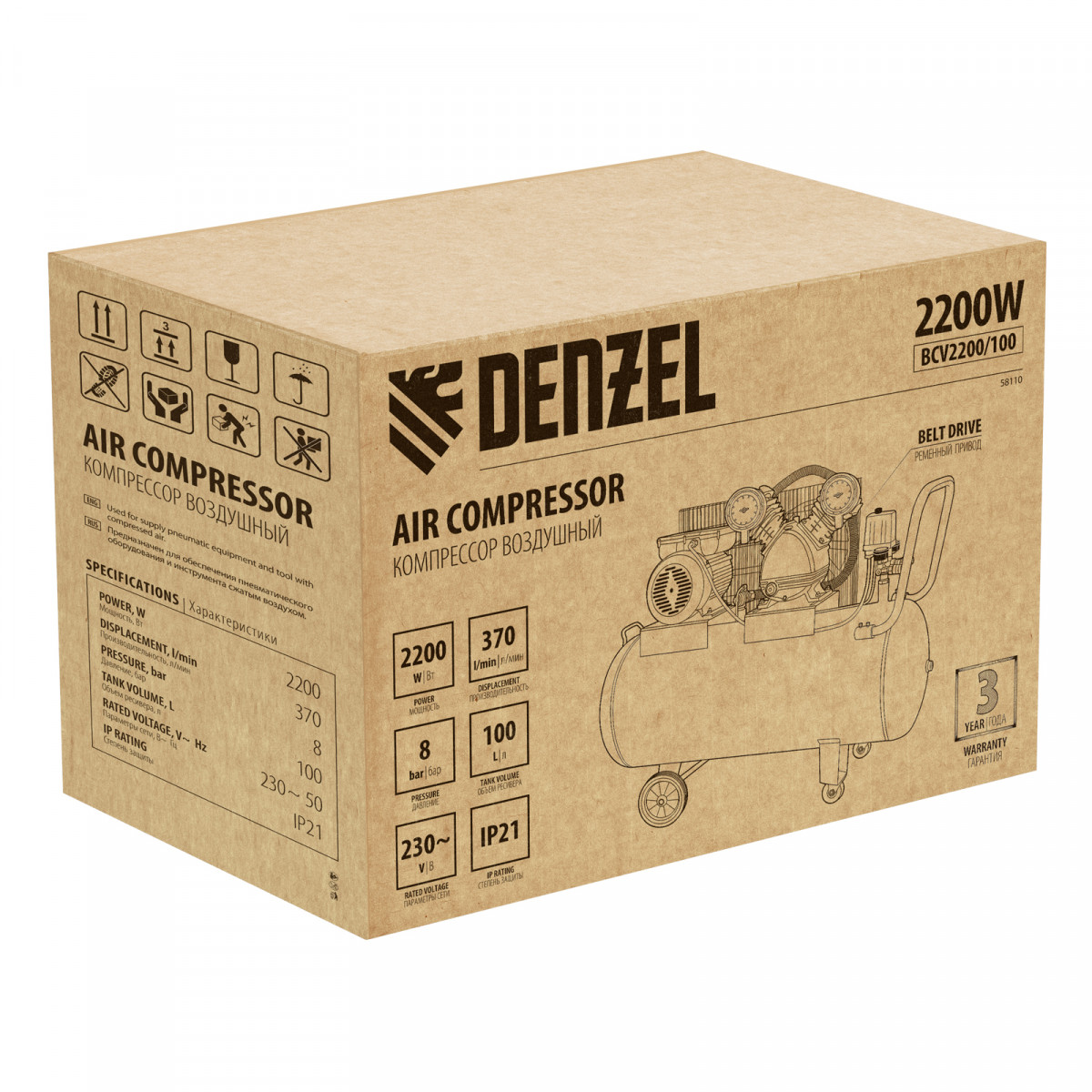 Компрессор воздушный BCV2200/100, ременный привод, 2.2 кВт, 100 литров, 370 л/мин Denzel