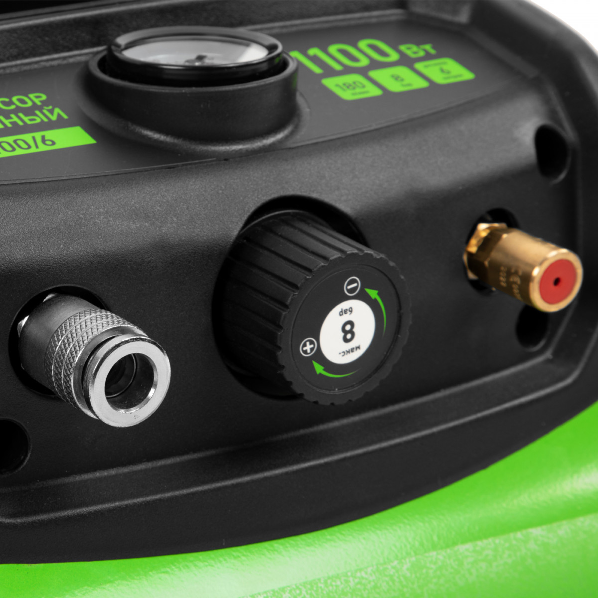 - Контроль давления в ресивере — в верхней части корпуса расположен манометр, для считывания показателей не нужно наклоняться.