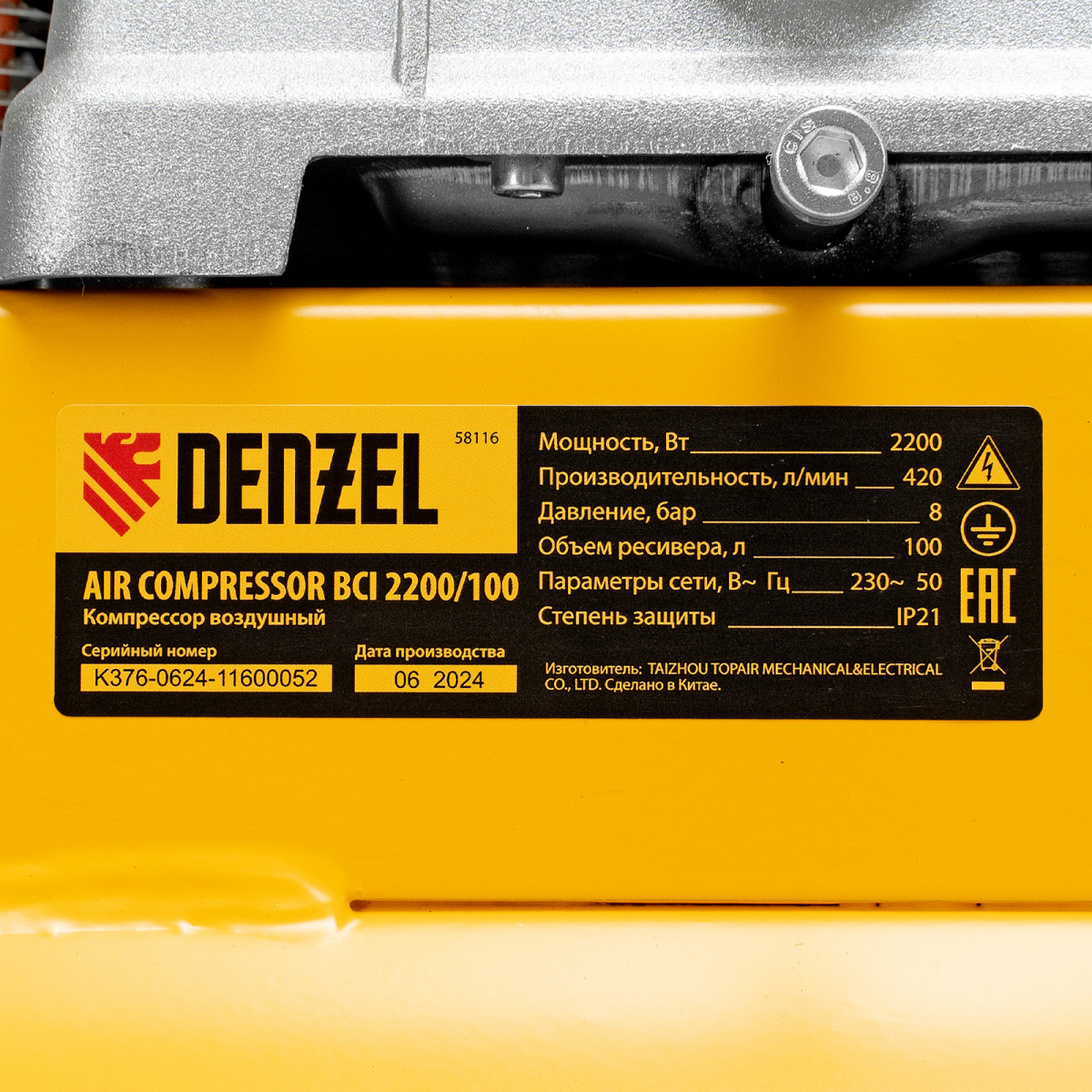 Компрессор воздушный рем. привод BCI 2200/100, 2,2 кВт, 100 литров, 420 л/мин Denzel